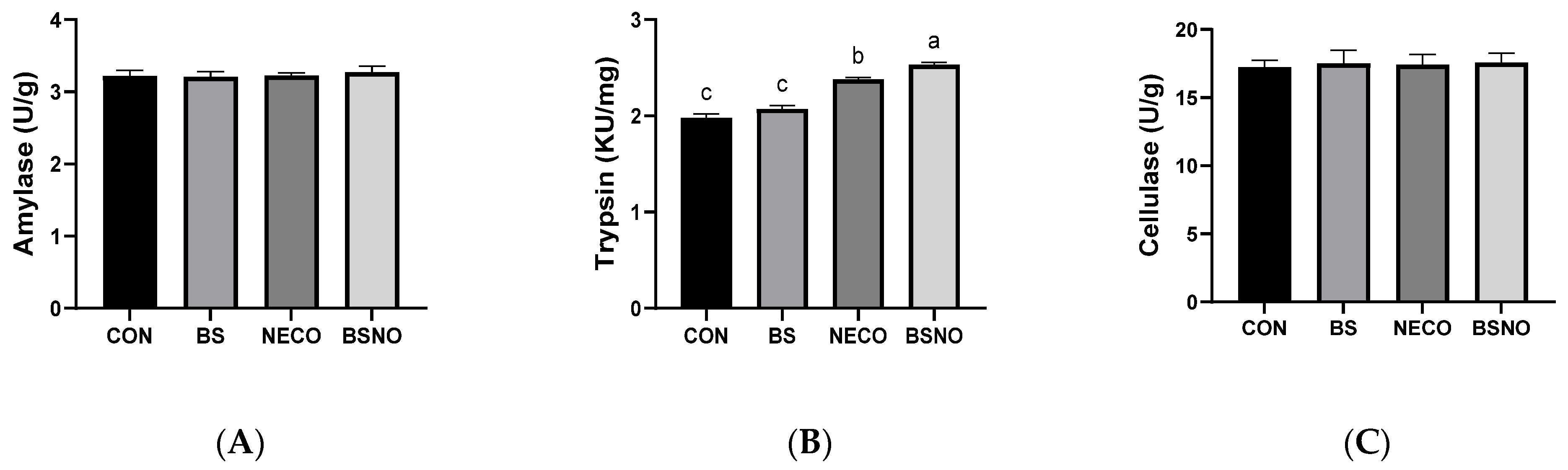 45]. In agreement with our findings, some reports indicate that essential oils, through their bioactive compounds, stimulate the secretion of digestive enzymes, which enhances nutrient digestibility [