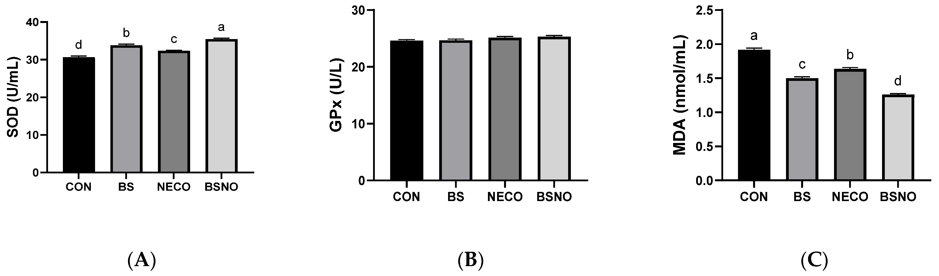 B. subtilis mixture increased the activity of antioxidant enzymes, such as SOD. In agreement with our results, several studies have reported that the addition of probiotics or essential oils enhanced the oxidative status by increasing antioxidant enzymes, including SOD, GPx, and TAC [