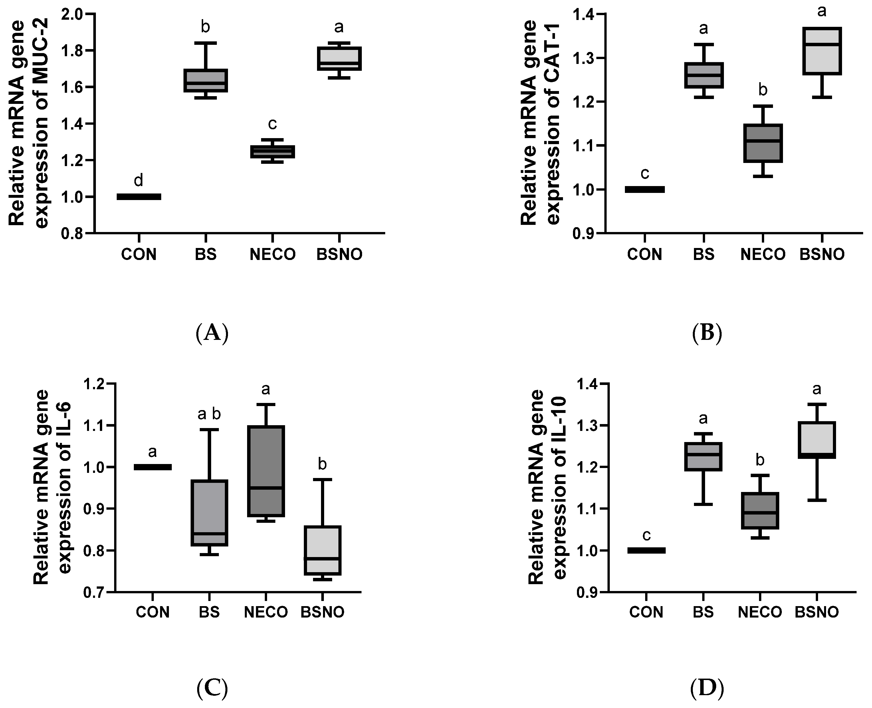 B. subtilis mixture had a significant effect on gene expression, increasing expression of IL-10, CAT-1, and MUC-2 genes, while decreasing expression of IL-6. Similarly, previous reports found that adding essential oils had a modulatory effect on the MUC-2 and IL-10 genes [