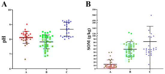 Additionally, the descriptive statistics of organic matter content in the soil of the study areas are displayed in Figure 2B, ranging from 2.90 to 499.19 g/kg across three selected dairy farms. Notably, the average values of dairy farms A, B, and C are 13.5 g/kg, 58.0 g/kg, and 82.3 g/kg, respectively, manifesting a significant difference in organic matter content among these three dairy farms. According to the second national soil survey from 2005 to 2014, the organic matter content in soil can be divided into six levels, with dairy farm A being assigned to the fourth level (10–20 g/kg) and dairy farms B and C reaching the first level (greater than 40 g/kg).