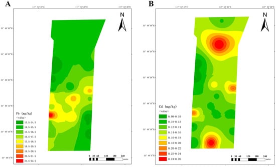Spatial distribution of lead (A) and cadmium (B) at dairy farm B.