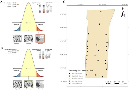Analysis of global and local Moran’s I index at dairy farm C. (A) Global Moran’s I index analysis of lead. (B) Global Moran’s I index analysis of cadmium. (C) Local Moran’s I index analysis of lead.