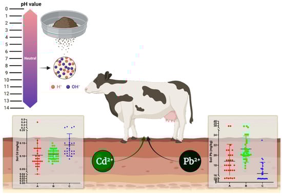 However, the majority of studies on the presence of heavy metals have been confined to urban areas or rice paddies, with no inquiry into heavy metal content in dairy farms []. In view of this, this study conducted environmental sampling surveys of three dairy farms in Jiangsu. The primary objectives of this study are (1) to determine the content, distribution, and pollution levels of lead and cadmium in the soil of the selected dairy farms; (2) to determine the main factors governing the accumulation of lead and cadmium content; and (3) to evaluate the extent of pollution caused by lead and cadmium in these dairy farms.