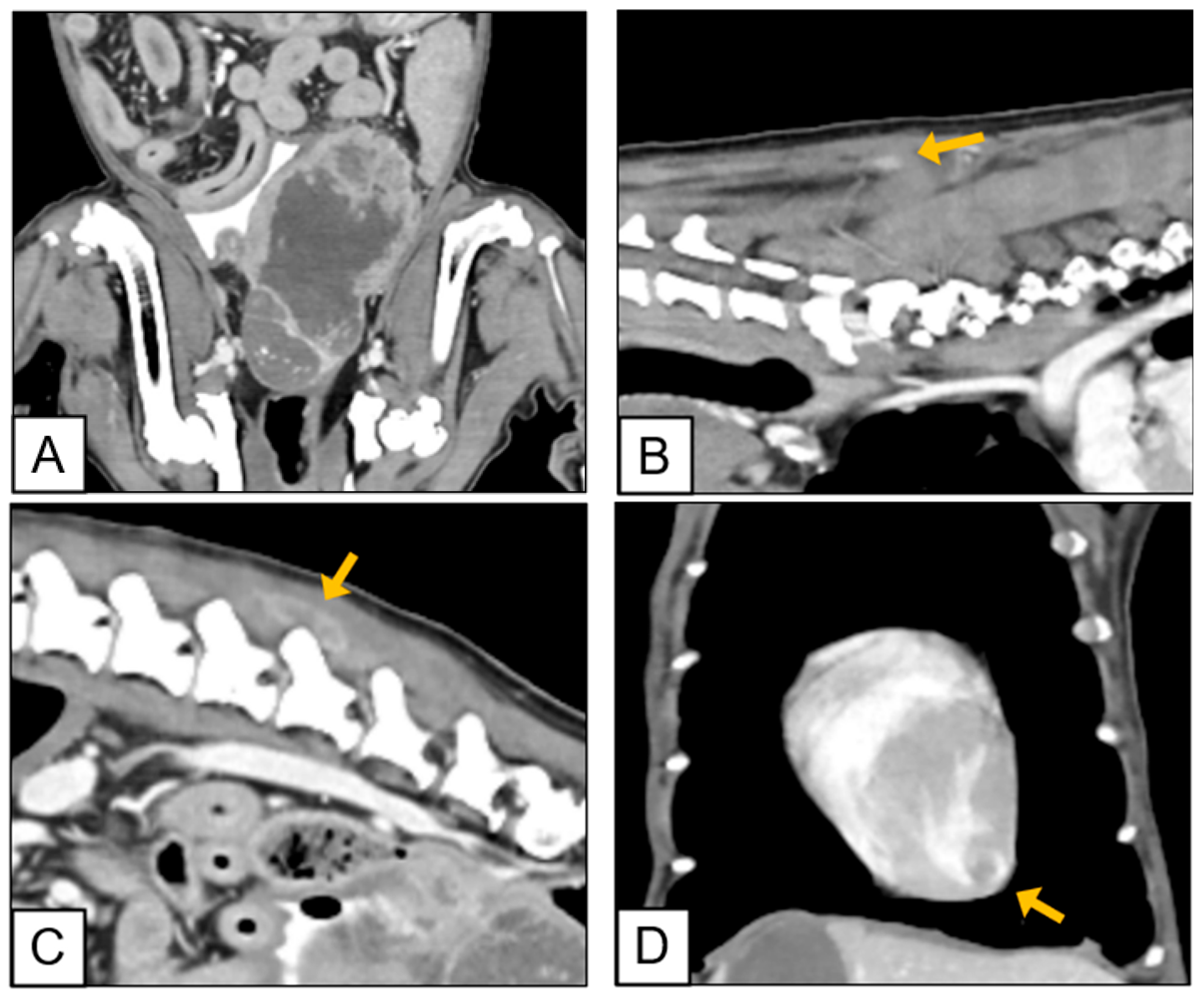 - Urlings, P.; Gramer, I.; Jones, C.; Dirrig, H. Computed tomographic features of canine prostatic carcinoma. Vet. Radiol. Ultrasound 2024, 65, 447–455. [Google Scholar] [CrossRef] [PubMed]