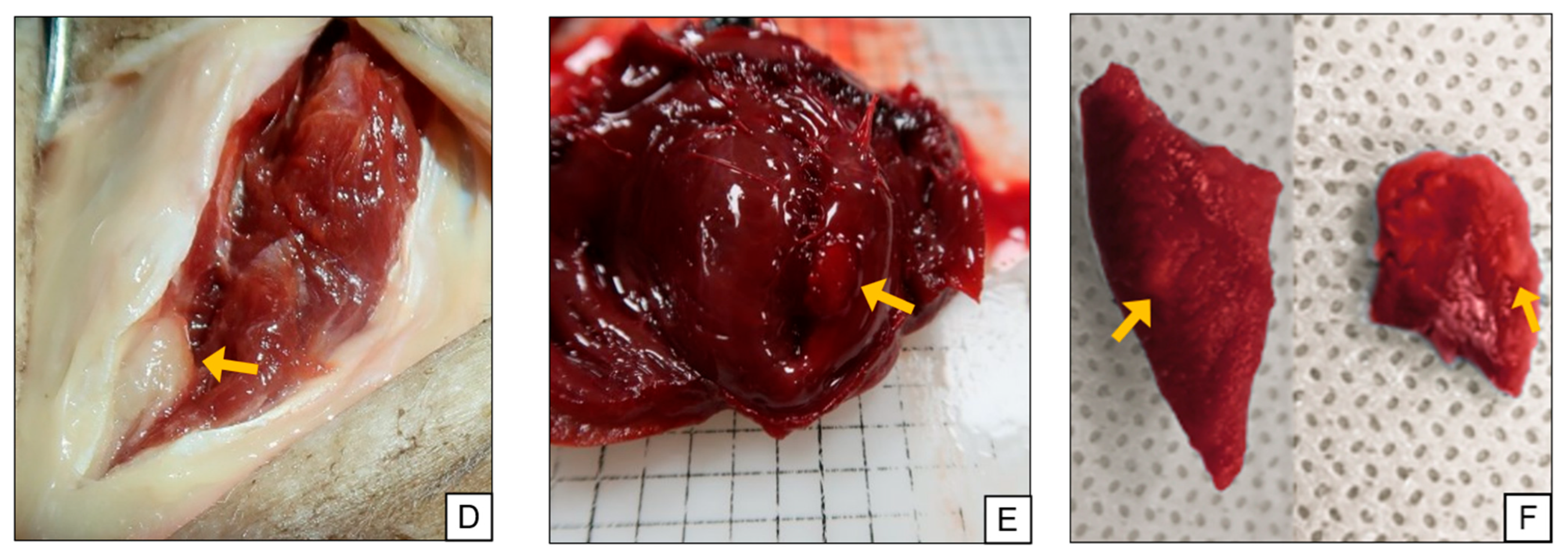 - Carloni, A.; Terragni, R.; Morselli-Labate, A.M.; Paninarova, M.; Graham, J.; Valenti, P.; Alberti, M.; Albarello, G.; Millanta, F.; Vignoli, M. Prevalence, distribution, and clinical characteristics of hemangiosarcoma-associated skeletal muscle metastases in 61 dogs: A whole body computed tomographic study. J. Vet. Intern. Med. 2019, 33, 812–819. [Google Scholar] [CrossRef]