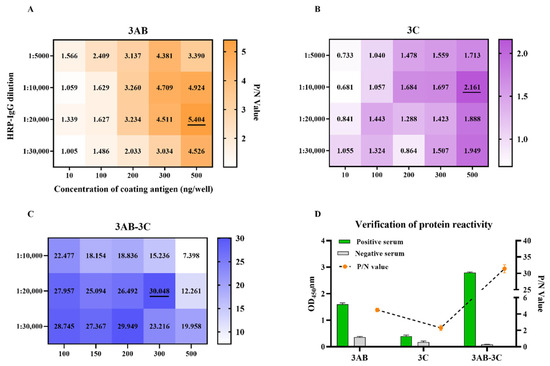 The reaction conditions for the iELISAs were developed by checkerboard titration based on high P/N ratios. As shown in Figure 2A–C, the optimal coating concentrations were determined to be 500 ng/well for r3AB, 500 ng/well for r3C, and 300 ng/well for the r3AB-3C tandem protein. All assays used a uniform serum dilution of 1:50. The secondary antibody (HRP-conjugated goat anti-pig IgG) was used at dilutions of 1:20,000 for the 3AB and 3AB-3C iELISAs, and 1:10,000 for the 3C iELISA. Incubations for serum and secondary antibody were conducted at 37 °C for 30 min each, followed by a 15 min incubation with TMB substrate at 37 °C in the dark. Coating and blocking were performed at 4 °C for 24 h.