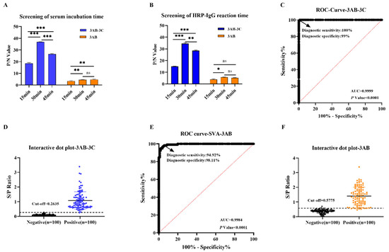 The incubation times for serum and secondary antibody were further optimized. As shown in Figure 3A,B, 30 min was optimal for both steps in the r3AB-3C iELISA. For the r3AB iELISA, a 30 min incubation was also selected, as extending it to 45 min provided no significant improvement, favoring a shorter, standardized protocol.