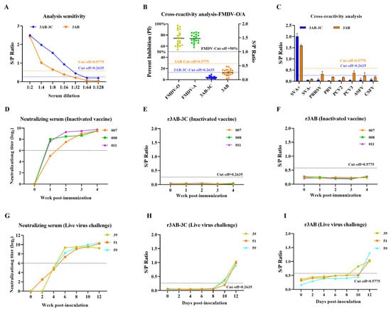 Evaluation of the analytical and diagnostic performance of the SVA iELISAs. (A) Analytical sensitivity was determined by two-fold serial dilution (1:2 to 1:128) of a high-titer SVA-positive serum. (B) Cross-reactivity assessment with FMDV serotype O/A-positive sera (n = 20). FMDV-specific percent inhibition (PI) values (left axis) were obtained from commercial kits, and S/P ratios for SVA antigens are shown (right axis). (C) Specificity evaluation using antisera against other swine pathogens (PRRSV, PRV, PCV2, PCV3, ASFV, CSFV). (D–F) Analysis of pigs immunized with inactivated SVA vaccine (n = 3) to confirm DIVA capability. (D) Virus neutralization antibody titers. (E,F) IgG antibody kinetics against (E) r3AB-3C and (F) r3AB. (G–I) Analysis of pigs from the challenge study infected with live SVA (n = 3) to compare diagnostic sensitivity. (G) Virus neutralization titers. (H,I) IgG antibody kinetics against (H) r3AB-3C and (I) r3AB. The dashed horizontal line in panels indicates the assay-specific cut-off value determined by maximizing Youden’s index.