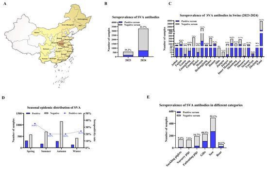 Seroepidemiological survey of SVA in Chinese swine herds (2023–2024). (A) Geographic distribution of sampling sites across 20 provinces in mainland China (brown shading). Sample sizes per province are: Anhui (n = 64), Fujian (n = 187), Gansu (n = 54), Guangdong (n = 100), Guangxi (n = 343), Hebei (n = 71), Henan (n = 1520), Heilongjiang (n = 77), Hubei (n = 314), Hunan (n = 125), Jilin (n = 20), Jiangsu (n = 11), Jiangxi (n = 98), Inner Mongolia (n = 291), Shandong (n = 115), Shanxi (n = 271), Shaanxi (n = 50), Sichuan (n = 90), Yunnan (n = 8), Zhejiang (n = 42). (B) Annual SVA seropositivity rates in 2023 and 2024. (C) Provincial SVA seropositivity rates. (D) Seasonal distribution of SVA seropositivity. (E) SVA seropositivity rates across different pig categories. Data are presented as the number of positive (blue) and negative (light gray) sera.
