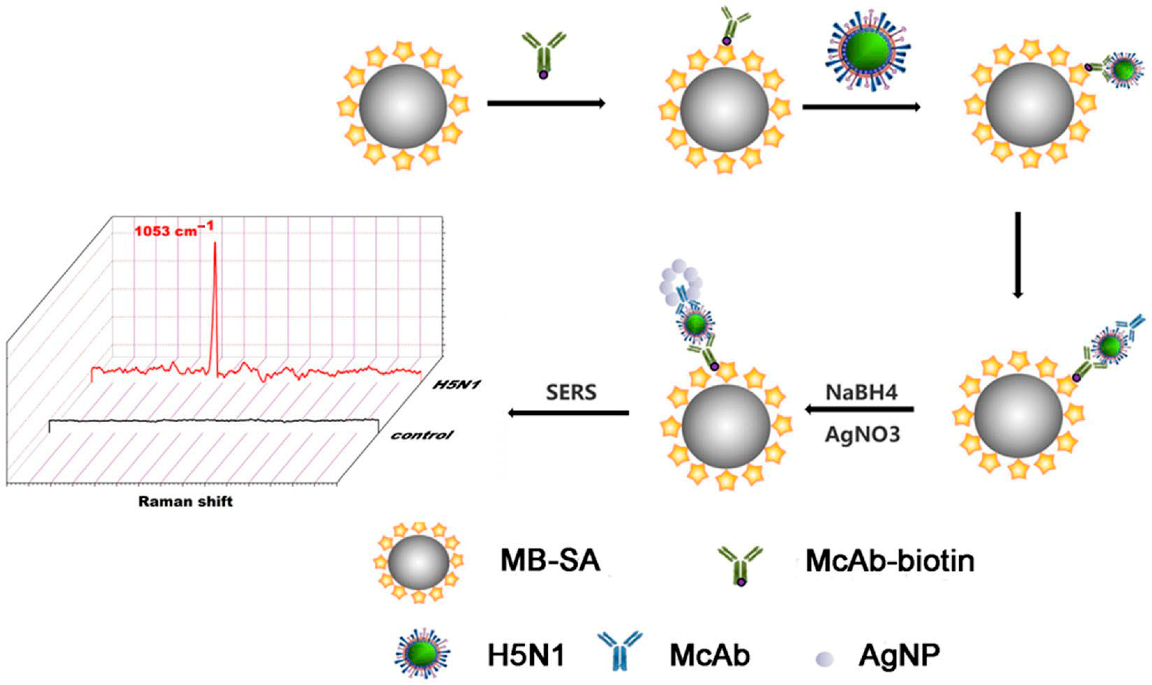 - Sun, Y.; Xu, L.; Zhang, F.; Song, Z.; Hu, Y.; Ji, Y.; Shen, J.; Li, B.; Lu, H.; Yang, H. A promising magnetic SERS immunosensor for sensitive detection of avian influenza virus. Biosens. Bioelectron. 2017, 89, 906–912. [Google Scholar] [CrossRef]