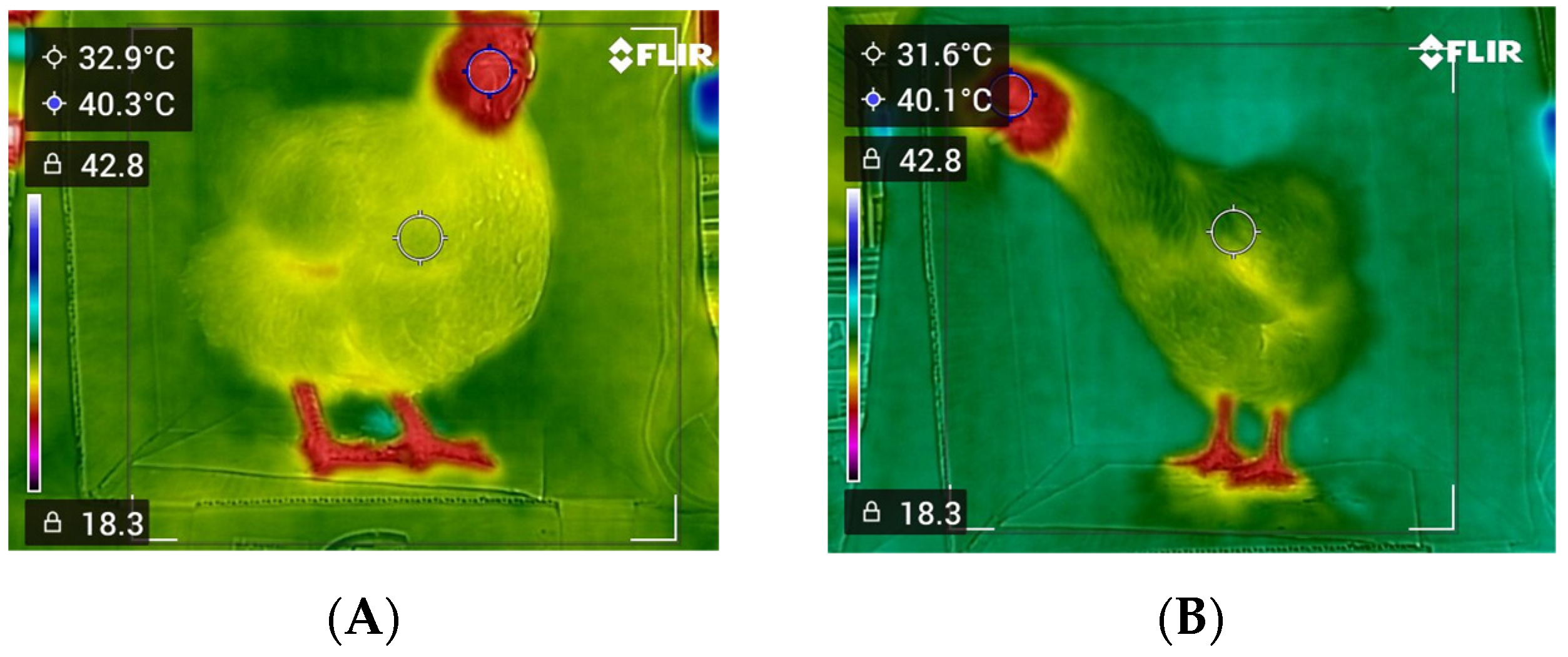- Giloh, M.; Shinder, D.; Yahav, S. Skin surface temperature of broiler chickens is correlated to body core temperature and is indicative of their thermoregulatory status. Poult. Sci. 2012, 91, 175–188. [Google Scholar] [CrossRef] [PubMed]