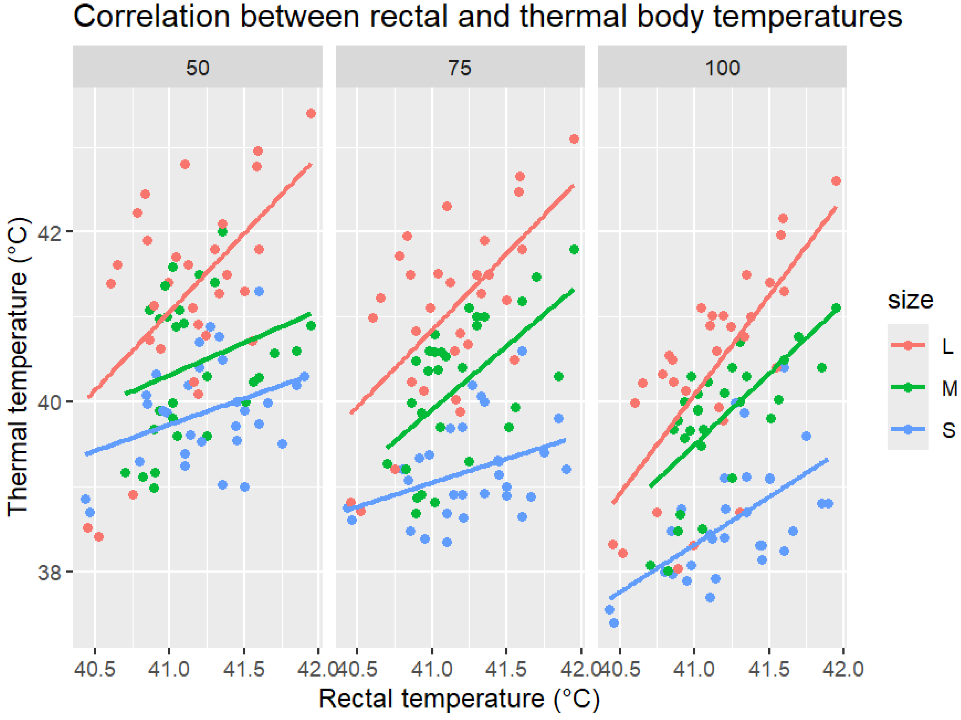 This study demonstrates that infrared thermography can be calibrated to rectal temperature in chickens, with body size and distance significantly affecting predictive accuracy. The positive association between thermal and rectal temperature is consistent with previous work showing the potential of IRT as a non-invasive screening tool. However, the modest explanatory power (R2 ≈ 0.28) suggests that additional physiological or environmental factors influence thermal recordings.