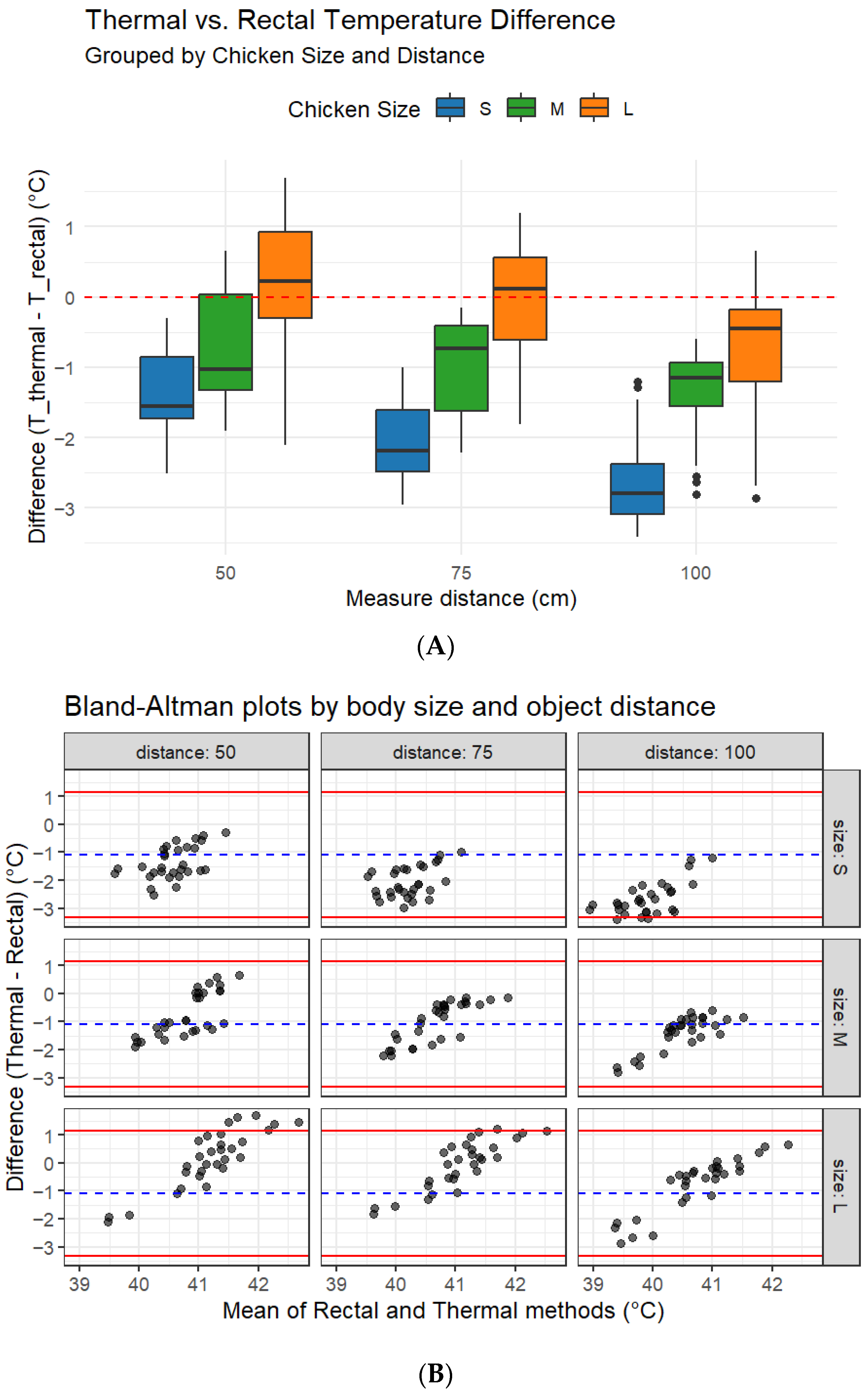 All analyses were performed in R (v. 4.5.1). Data were inspected for outliers and normality of differences, and thermal vs. rectal measurement agreement (Bland–Altman) was analyzed for each distance × size stratum, calculating bias, SD, root mean square error (RMSE), and mean absolute error (MAE). The 95% limits of agreement (LOA) were computed per stratum, and so were Lin’s concordance correlation coefficient (CCC) with bias-corrected 95% CIs and the Pearson coefficient (r).