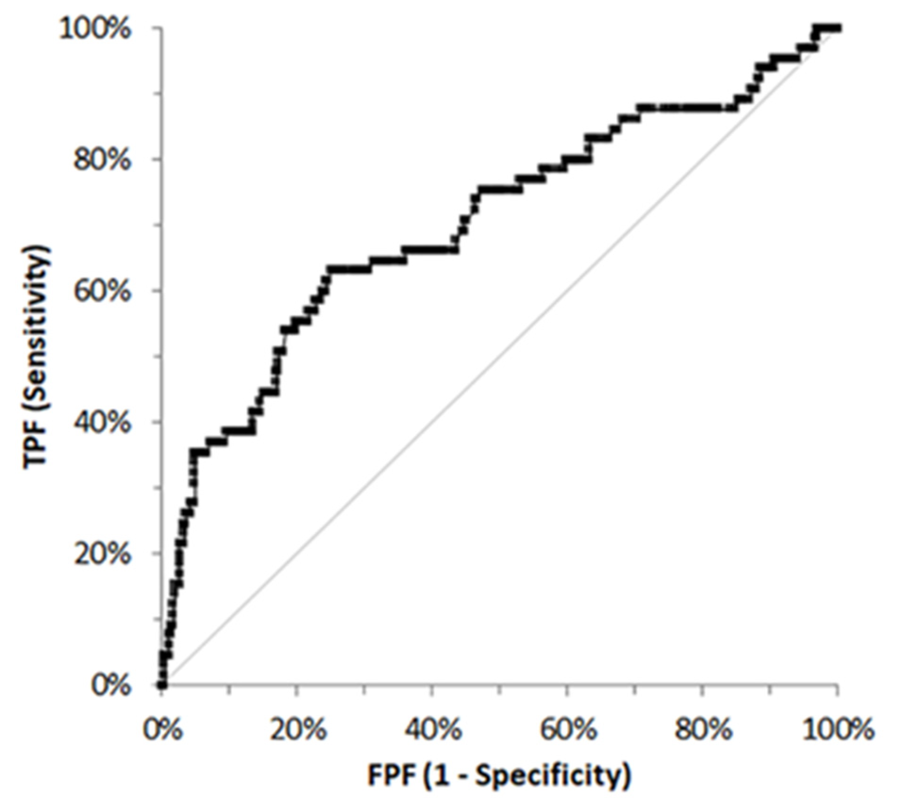 - True positives: hospitalized dogs with PON-1 values below the operating point;