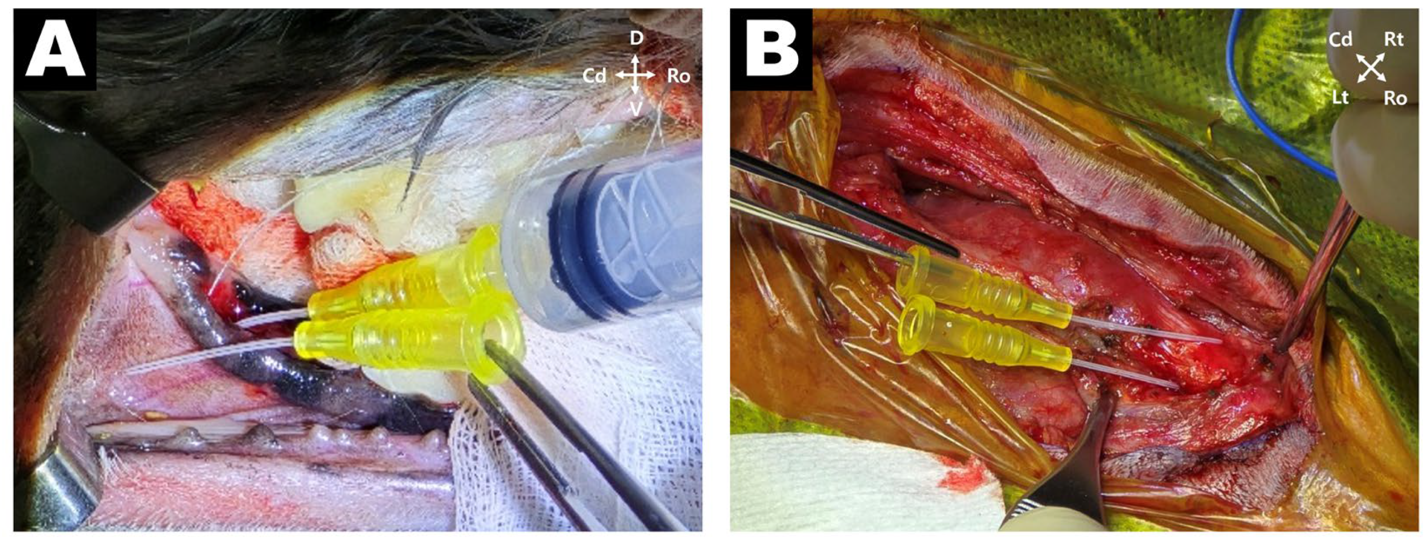 Figure 3A). Hemostasis was achieved using epinephrine-soaked gauze, and the exposed socket was closed with a gingival flap using 4-0 Monocryl in a simple interrupted pattern. The patient was then repositioned in dorsal recumbency with the neck extended in a humanoid position. A skin incision was made over the submandibular lesion to approach the subcutaneous tract. The purulent exudate and inflamed fibrous tissue were thoroughly debrided. Two enlarged mandibular lymph nodes adjacent to the lesion were identified, resected, and submitted for histopathological analysis. To reconfirm tract continuity, a 24-gauge catheter was inserted into the center of the submandibular lesion and successfully passed into the mandibular bone, delineating the full path of the OCF (