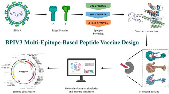 In this study, we selected BPIV3 F and HN glycoprotein as protein targets, screened their immunodominant CTL, HTL, and B cell epitopes, and constructed a BPIV multi-epitope-based peptide vaccine through flexible serial connection. Then, the physicochemical properties, antigenicity, immunogenicity, toxicity, as well as the secondary and tertiary structures of the predicted multi-epitope-based peptide vaccine were analyzed and predicted. Subsequently, the binding affinity of the multi-epitope peptide vaccine to Toll-like receptors (TLRs) and its potential immunogenicity against BPIV were assessed by molecular docking, molecular dynamics simulations, and immunological simulation studies(Figure 1).
