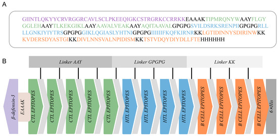 Construction of the multi-epitope-based peptide vaccine (MEBPV). (A) Amino acid sequence of the vaccine construct, highlighting CTL epitopes (green), HTL epitopes (blue), B-cell epitopes (orange), linker peptides (gray), β-defensin-3 sequence (light purple), and the 6×His tag (gray). (B) Schematic diagram of the vaccine construct.