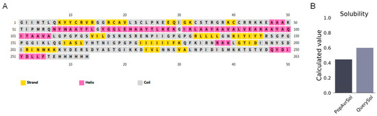 Secondary Structure Prediction and Solubility Assessment of the MEBPV. (A) Secondary structure prediction of multi-epitope vaccines using the PSIPRED tool. (B) Solubility prediction of multi-epitope vaccines performed with the ProtSol server.