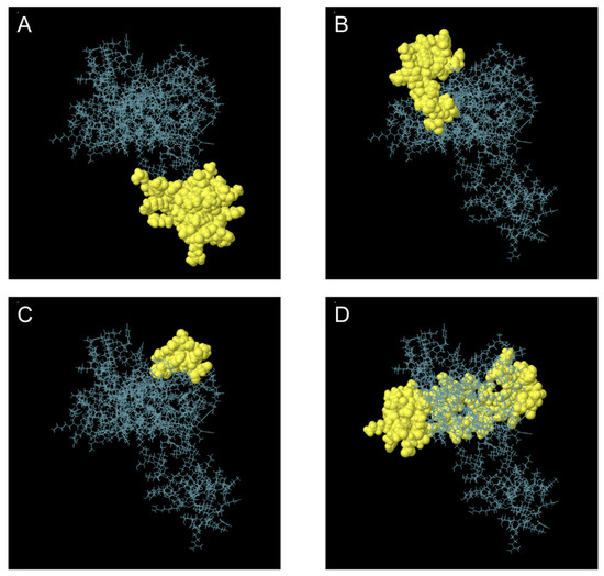 Three-Dimensional Representation of Discontinuous B Cell Epitopes in the Multi-Epitope Vaccine. (A–D) Discontinuous B cell epitopes are highlighted in yellow, while the remaining polypeptide regions are depicted as blue bars.