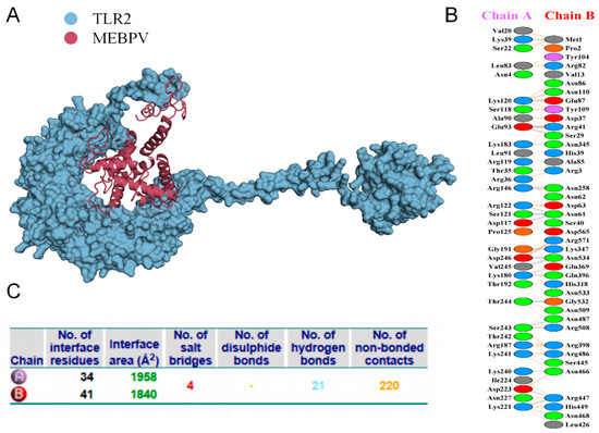 Docking of MEBPV with Bovine TLR-2 Molecules. (A) The docking complex between bovine TLR-2 and MEBPV. (B) Interacting amino acids at the interface of MEBPV (chain A) and TLR-2 (chain B). (C) Analysis of bond types formed within the docking complexes.