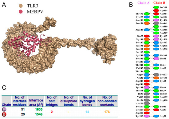 Docking of MEBPV with Bovine TLR-3 Molecules. (A) The docking complex between bovine TLR-3 and MEBPV. (B) Interacting amino acids at the interface of MEBPV (chain A) and TLR-3 (chain B). (C) Analysis of bond types formed within the docking complexes.