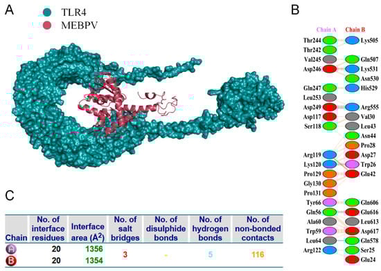 Docking of MEBPV with Bovine TLR-4 Molecules. (A) The docking complex between bovine TLR-4 and MEBPV. (B) Interacting amino acids at the interface of MEBPV (chain A) and TLR-4 (chain B). (C) Analysis of bond types formed within the docking complexes.