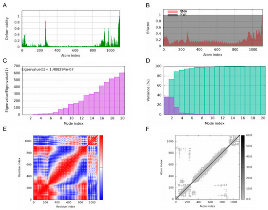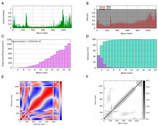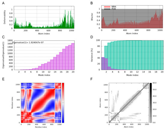 Molecular Dynamics Simulations of MEBPV-TLR3 Complexes. (A) Deformability analysis plot. (B) B-factor analysis plot. (C) Eigenvalue distribution plot. (D) Structural variance plot. (E) Covariance matrix plot. (F) Elastic network model plot.
