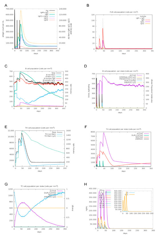 Immunological Simulation Analysis. (A) Immunoglobulin response to MEBPV vaccine. (B) Changes in plasma cell (PLB) populations. (C) B-cell populations. (D) Number of B cells per state. (E) TH cell populations. (F) Number of TH cells per state. (G) Number of TC cells per state. (H) Concentrations of interleukins and cytokines.