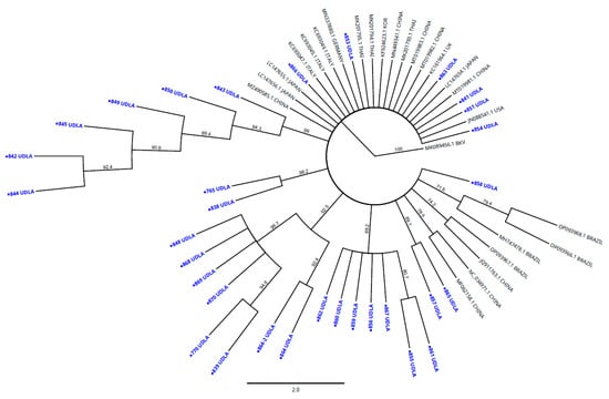The Ecuadorian CaKoV sequences (n = 32), obtained from a 3D fragment, showed high NT similarity among themselves, ranging from 94.65% to 100%. The sequences studied also showed high NT similarity with other sequences from various countries retrieved from GenBank, specifically, an NT similarity between 94.06 and 97.43% with sequences from Brazil; 94.06–97.82% with sequences from China; 93.47–96.44% with sequences from Germany; 95.01–97.05% with sequences from Italy; 95.04–97.62% with sequences from Japan; 94.26–97.62% with sequences from South Korea; 94.26–97.03% with sequences from Thailand; 93.27–95.84% with sequences from the United States; and 94.06–95.84% with sequences from the United Kingdom. The NT matrix showed high similarity between the sequences described above, showing less than 7% of NT differences between them (Supplementary Material). The phylogenetic analysis of a portion of the 3D region showed that the sequences obtained here clustered with other sequences of CaKoV from Brazil, Germany, the United States, the United Kingdom, Thailand, Japan, China, Italy, and South Korea. All sequences were clustered in a unique group (clade bootstrap value 100%) (Figure 4).