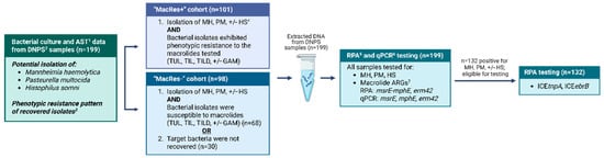 Flowchart of the diagnostic testing strategy used for bacterial culture, antimicrobial susceptibility testing, recombinase polymerase amplification, and quantitative polymerase chain reaction testing of deep nasopharyngeal swabs collected from calves for the detection of bacteria commonly associated with bovine respiratory disease and antimicrobial resistance targets of interest (n = 199). 1 AST: antimicrobial susceptibility testing; 2 DNPS: deep nasopharyngeal swab. 3 Possible phenotypic resistance to antimicrobial drugs included ampicillin, gamithromycin (GAM), spectinomycin, tetracycline, tilmicosin (TIL), tildipirosin (TILD), and tulathromycin (TUL). 4 MH: Mannheimia haemolytica, PM: Pasteurella multocida, HS: Histophilus somni. 5 RPA: recombinase polymerase amplification; 6 qPCR: quantitative polymerase chain reaction; 7 ARGs: antimicrobial resistance genes, in this case referring to macrolide ARGs msrE, mphE, and erm42. Only samples that tested positive for M. haemolytica, P. multocida, or H. somni using RPA were tested for mobile genetic element variants ICEtnpA and ICEebrB; Created in BioRender. L, S. (2025) https://www.biorender.com/ accessed on 10 November 2025.