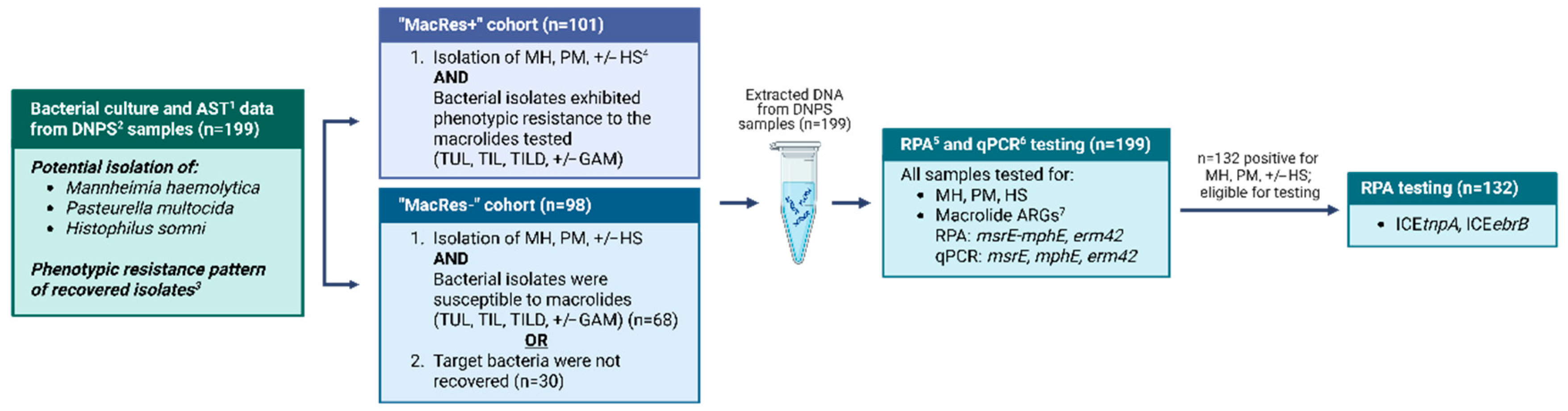 - Dutta, E.; Loy, J.D.; Deal, C.A.; Wynn, E.L.; Clawson, M.L.; Clarke, J.; Wang, B. Development of a Multiplex Real-Time PCR Assay for Predicting Macrolide and Tetracycline Resistance Associated with Bacterial Pathogens of Bovine Respiratory Disease. Pathogens 2021, 10, 64. [Google Scholar] [CrossRef]