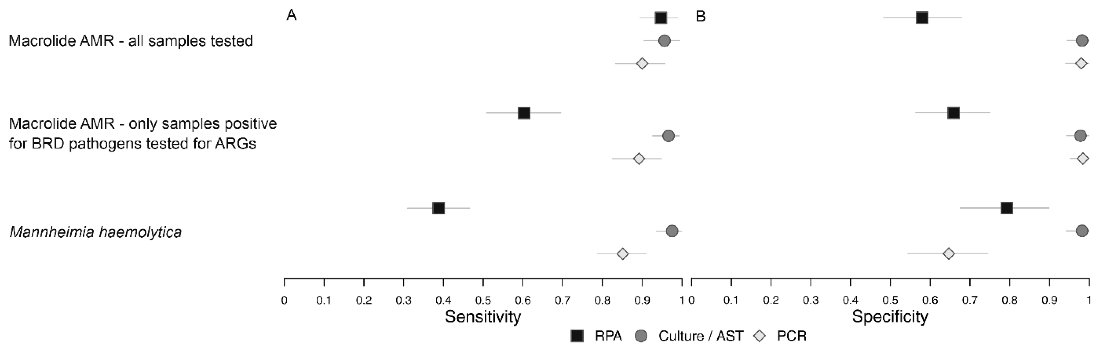 | Macrolide resistance 1,2,3,4 | RPA 4, AST 2 | 0.52 (0.41, 0.64) |
