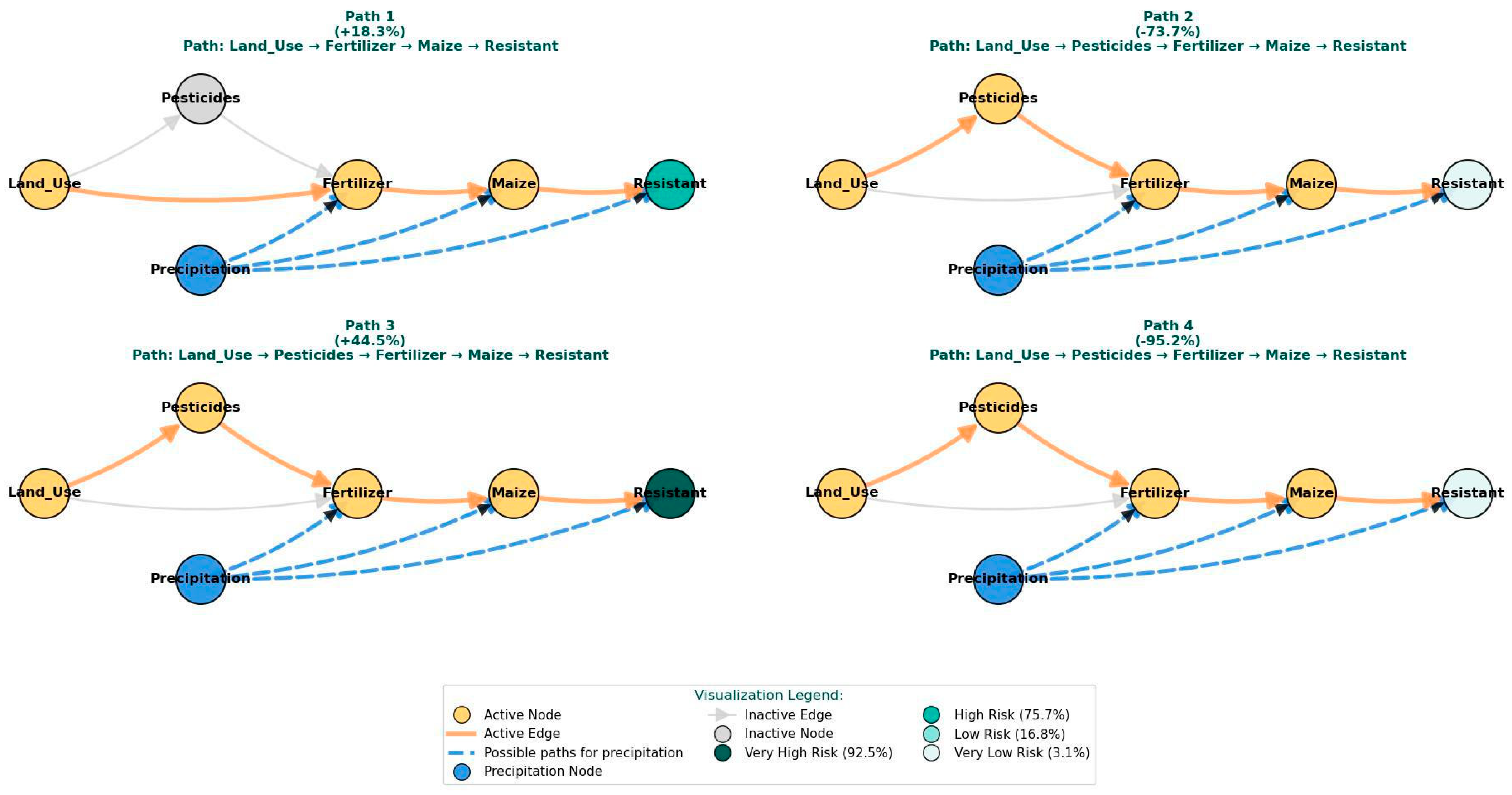 | Path 3 | 9.36 M→17.11 M | Pest: 11 K→47 K Fert: 606 K→1.22 M Maize: 11 K→9 K | Moderate precipitation optimizes environmental persistence |