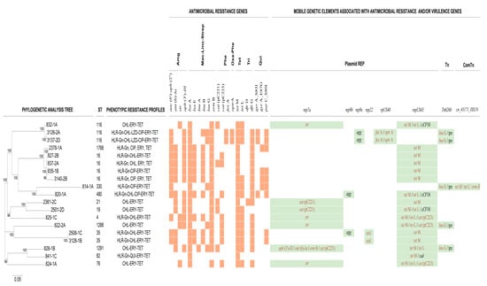 In addition, genes conferring resistance to other antimicrobials not included in the commercial panel used for phenotypic resistance screening were also identified (Table S1). Thus, the ant(6)-Ia and str genes, which confer resistance to streptomycin, were detected in 11 and four isolates, respectively, whereas the aph(3′)-III gene, which confers resistance to kanamycin, was detected in 13 isolates. The presence of the dfrG gene, which confers resistance to trimethoprim, was identified in the genomes of 16 isolates. The lnu (lnuA, lnuB and lnuG) genes and lsa (lsaA and lsaE) genes conferring resistance to lincomycin were also frequently detected.