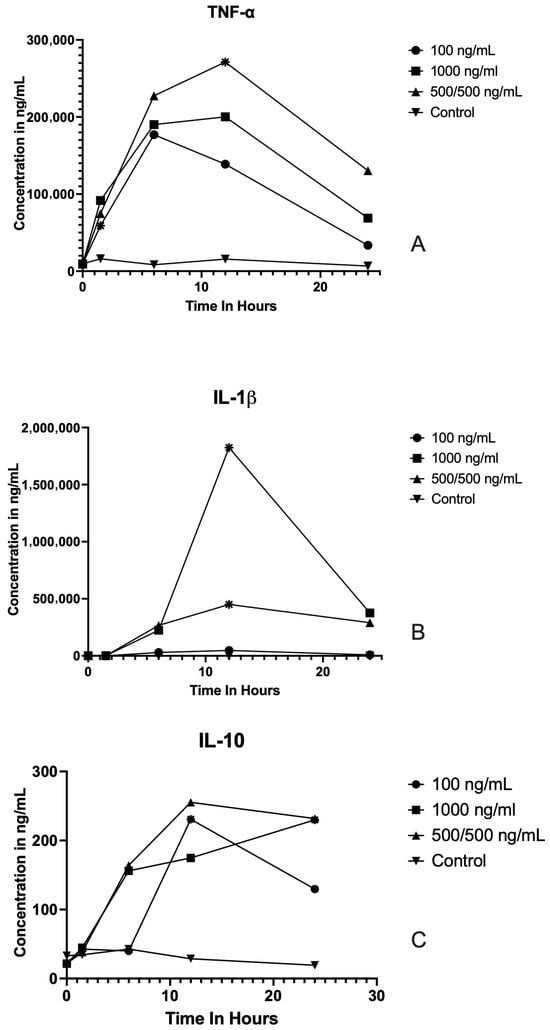 Cytokine concentration profiles following LPS stimulation at different concentrations and time points. Line graphs show the concentrations (ng/mL) of TNF-α (A), IL-1β (B), and IL-10 (C) measured at baseline and 1.5, 6, 12, and 24 h post LPS stimulation in cells treated with LPS at 0 ng/mL (control), 100 ng/mL,1000 ng/mL, or 500/500 ng/mL. Each point represents the mean. Significant differences (p < 0.05) compared to baseline or between indicated time points are denoted by asterisks. Cytokine concentrations peaked within the first 6–12 h following stimulation and generally declined by 24 h. TNF-α and IL-1β displayed more robust responses than IL-10, with higher LPS concentrations yielding greater cytokine release.