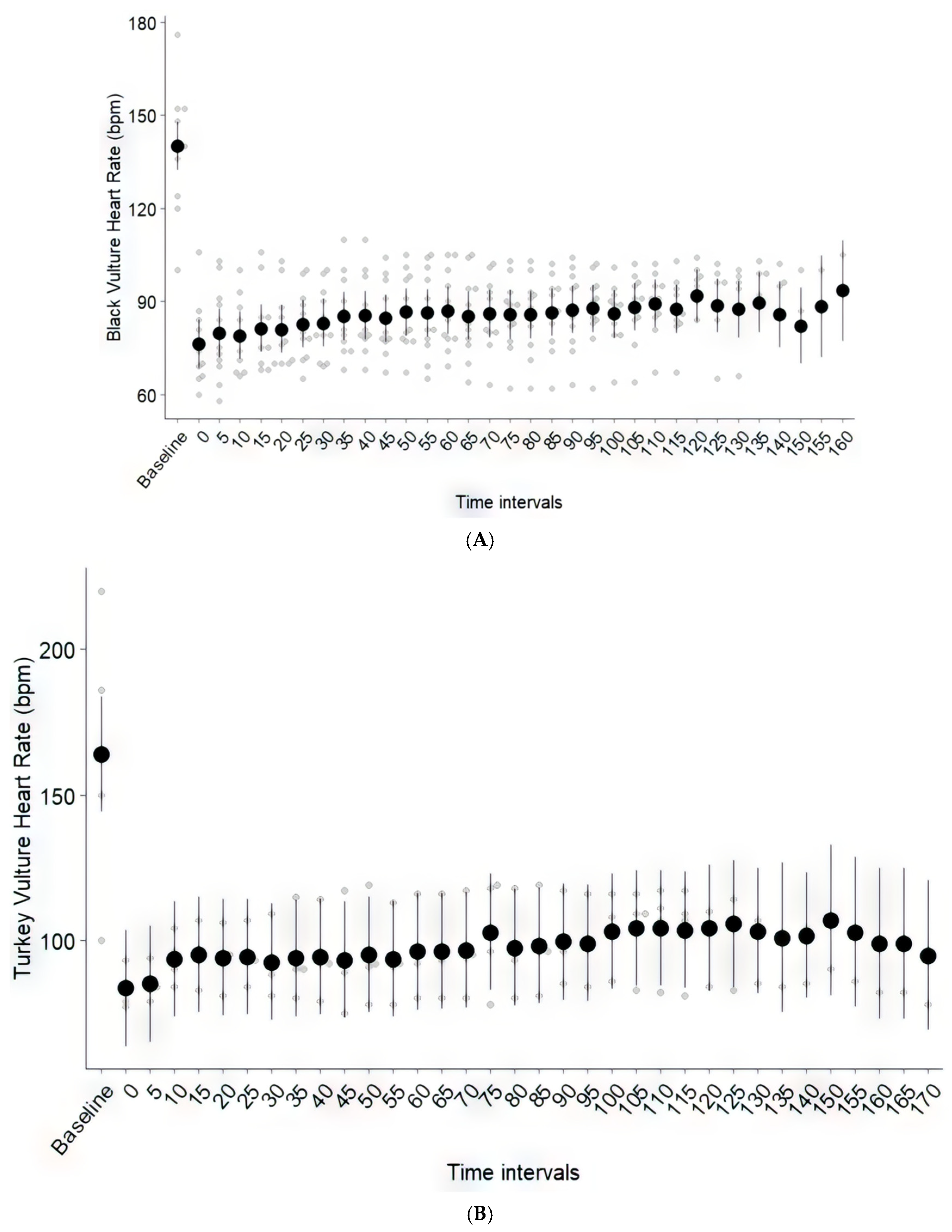 Figure 2. (A) Estimated marginal means of Black Vulture heart rate (beats per minute) across anesthesia time intervals, with standard error bars. Raw data points are shown in gray. All post-induction heart rate values (Time 0 onward) were significantly lower than the species’ awake baseline (p ≤ 0.001). (B) Estimated marginal means of Turkey Vulture heart rate (beats per minute) across anesthesia time intervals, with standard error bars. Raw data points are shown in gray. All post-induction heart rate values (Time 0 onward) were significantly lower than the species’ awake baseline (p ≤ 0.001).