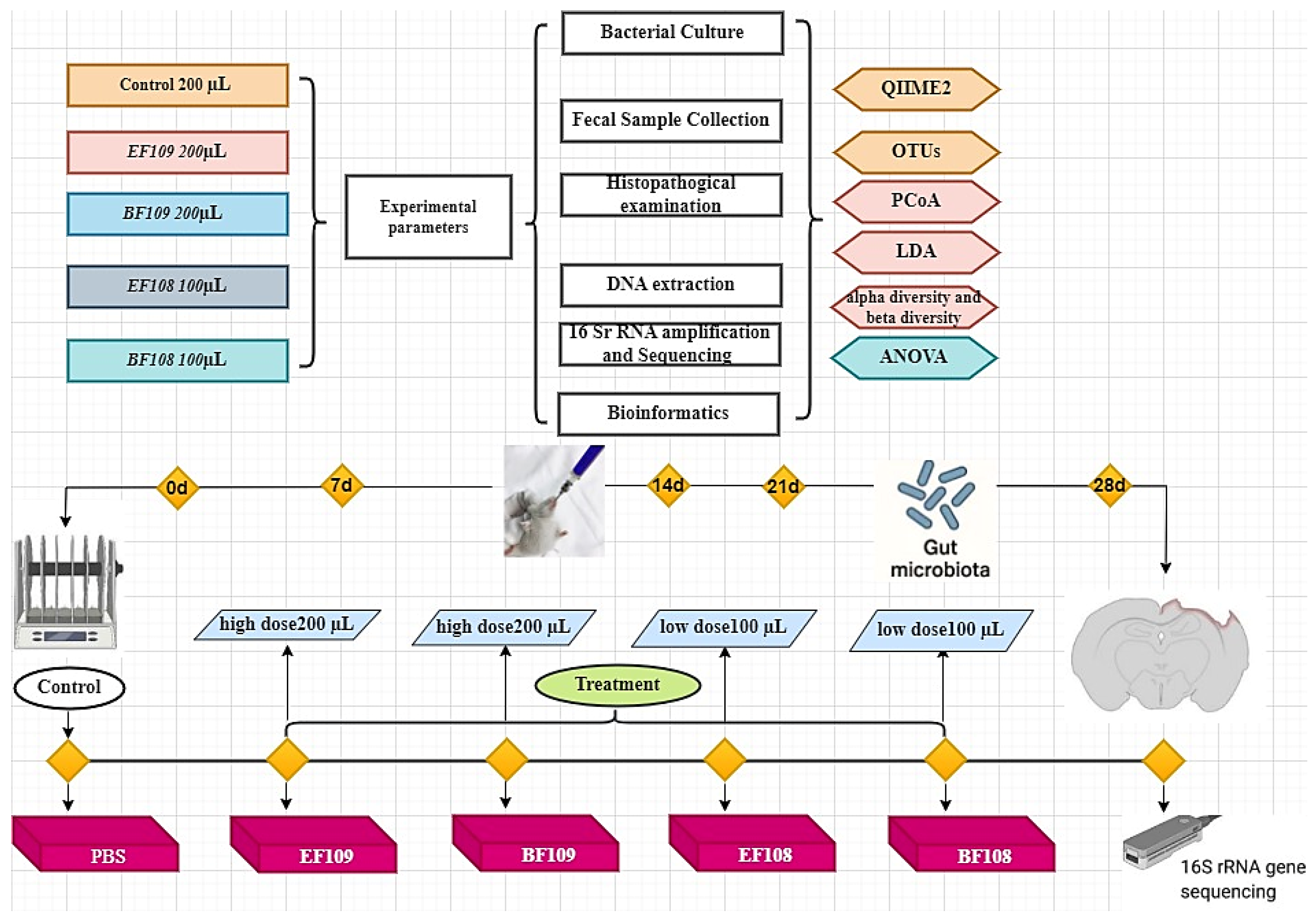 Consequently, the mice in the low-dose groups (BF108 and EF108) received 100 µL of the 1 × 108 CFU/mL suspension, providing a daily intake of 1 × 107 CFU per mouse. In contrast, the high-dose groups (BF109 and EF109) received 200 µL of the 1 × 109 CFU/mL suspension, corresponding to a total of 2 × 108 CFU per mouse per day. The control group was administered 200 µL of PBS through gavage. The dosing regimen is summarized in Table 1.