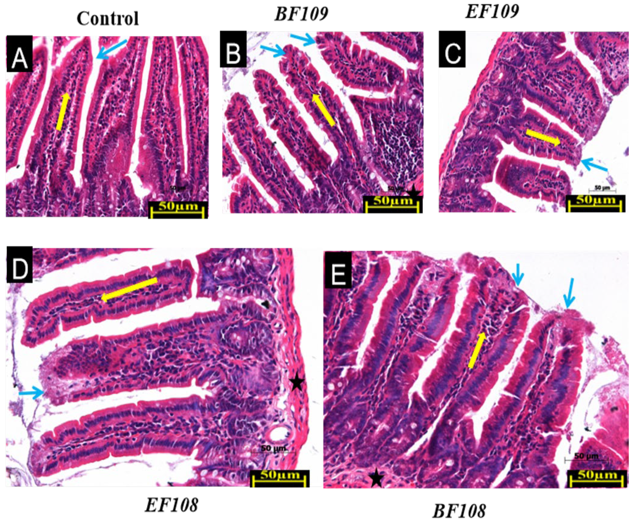 Figure 3. Histological analysis of intestinal tissues small intestine) from control and probiotic-treated mice. Tissues were stained with hematoxylin and eosin (scale bar magnification = ×50). Representative images are shown for the (A) Control group, (B) BF109 group, (C) EF109 group, (D) BF108 group, and (E) EF108 group. Key anatomical structures are indicated: Villi (blue arrow) in the small intestine; paneth cell (yellow arrow); Muscularis mucosae (black star is indicated across all segments). No pathological alterations in mucosal architecture, inflammatory infiltration, or epithelial integrity were observed in any of the treatment groups compared to the control.