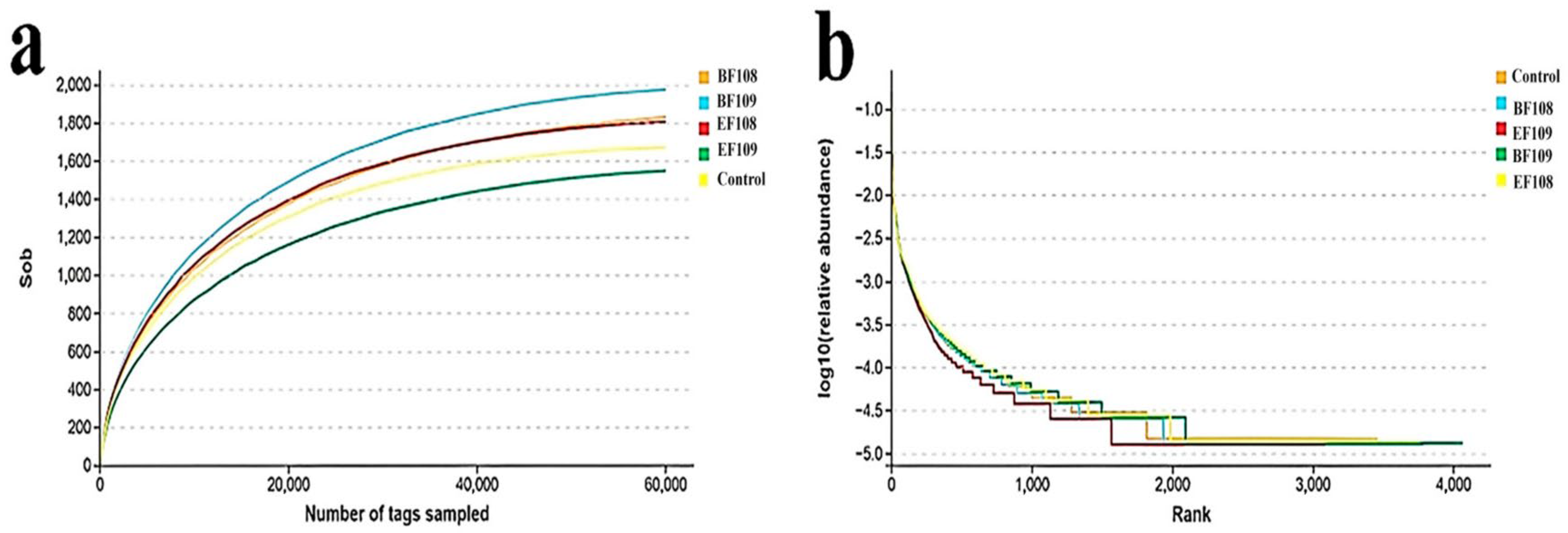 The original sequences generated via microbiome analysis comprised 285,961 from the control group, 301,808 from the EF109 group, 309,383 from the EF108 group, 314,318 from the BF109 group, and 270,025 from the BF108 group. After filtering the qualifying data, a total of 1,480,929 high-quality reads were collected from all samples, with an average of 98,728 reads per sample (ranging from 79,184 to 116,292). Using a 97% nucleotide sequence similarity threshold, a total of 14,289 OTUs were identified based on taxonomic categorization (control = 2735, EF109 = 2377, EF108 = 2904, BF109 = 3309, and BF108 = 2964), with 144 OTUs being common across all samples. The rarefaction and species accumulation curves for all samples were generally constant. Additionally, over 20,000 and 60,000 qualifying sequences were detected, demonstrating that the sequencing depth and quantity were adequate for analysis (Figure 4a,b).
