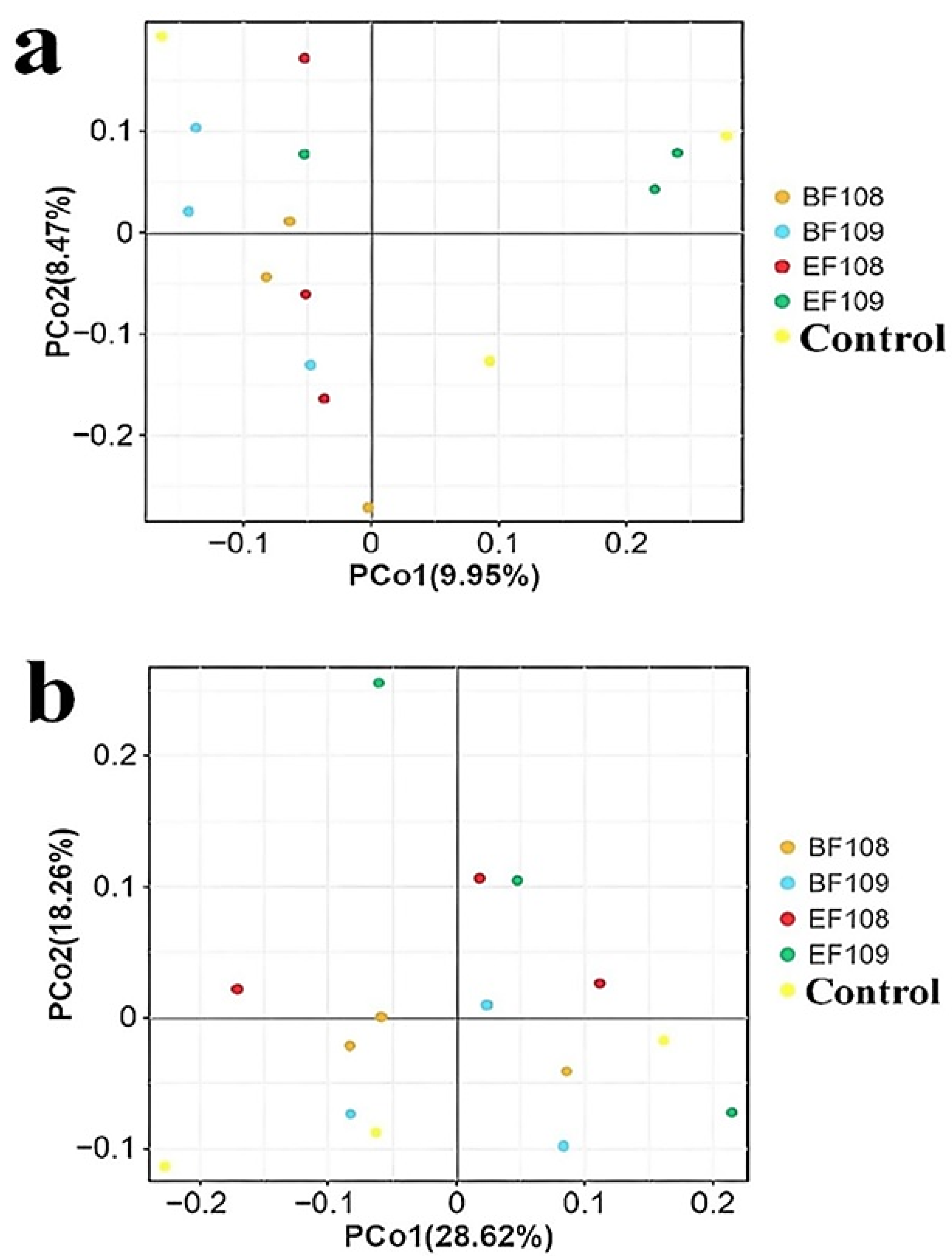 Fecal samples were collected from five groups of mice (Control, BF109, BF108, EF109, and EF108), with three mice per group. Sampling was performed at 0, 7, 14, 21 and 28 days of the experiment. Fecal samples were collected for longitudinal monitoring of the gut microbiota, as this non-invasive method allows for repeated sampling of the same animals over time and provides a well-established representation of the gut microbial community structure in response to dietary interventions. To prevent contamination, all mice were transferred to fresh, sterilized cages, and fecal material was collected immediately and stored at −80 °C. The body weight of each mouse was recorded every two days, beginning on the first day of the experiment.