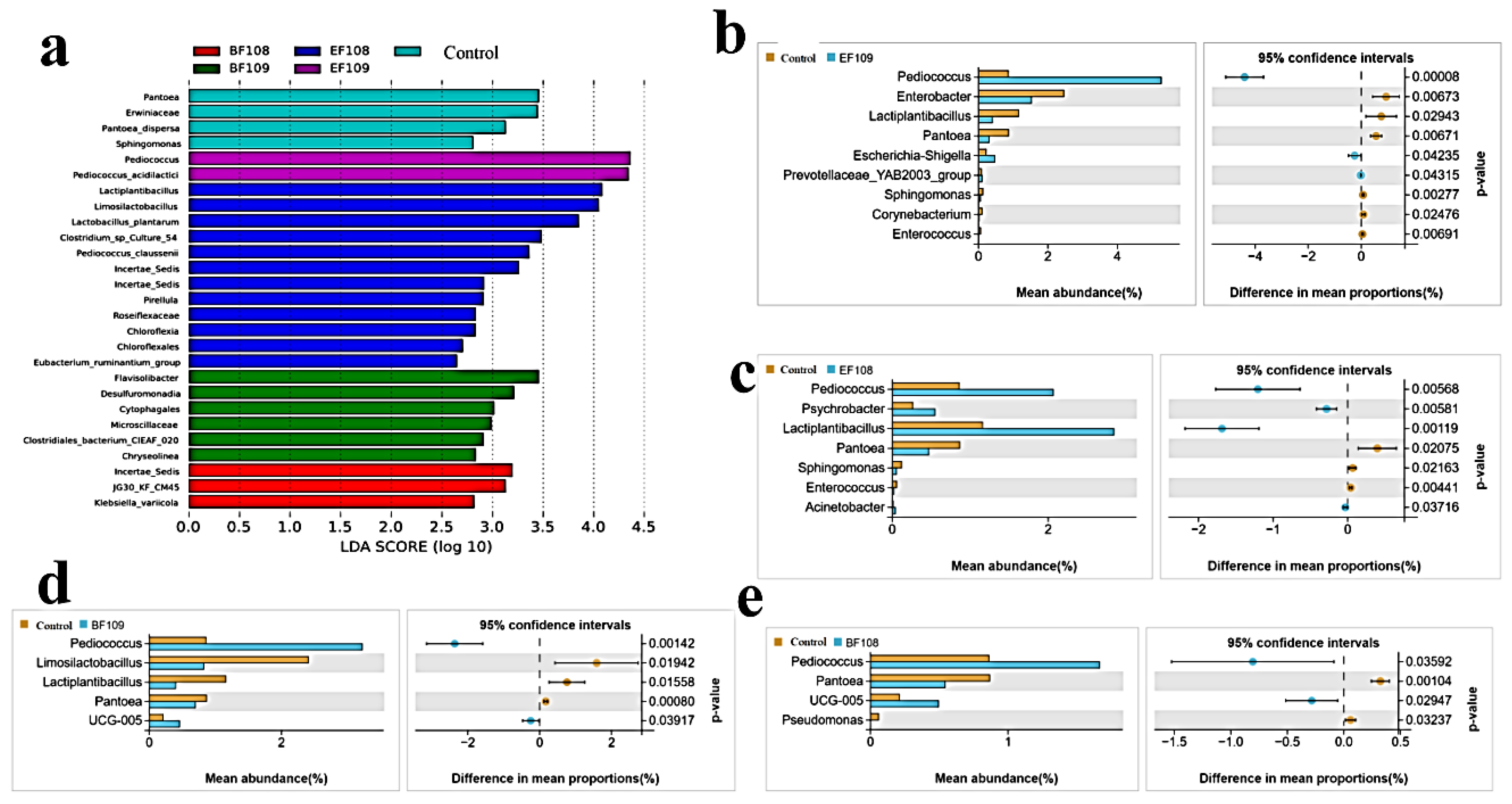 Figure 9. LEfSe analysis for the notable alterations in the differential fecal microbiota in several mouse groups. (a) In the five groups, the biomarker bacterial species were identified by the LEfSe analysis (LDA score > 4). (b) t-test analysis of the microbiota based on genus levels in groups EF109 and control. (c) Variable microbiota t-test analysis at the genus level for Group EF108 versus control. (d) BF109 group versus control microbiota t-test evaluations according to genus levels, and (e) t-test comparison between control and BF108 microbiota based on genus levels.