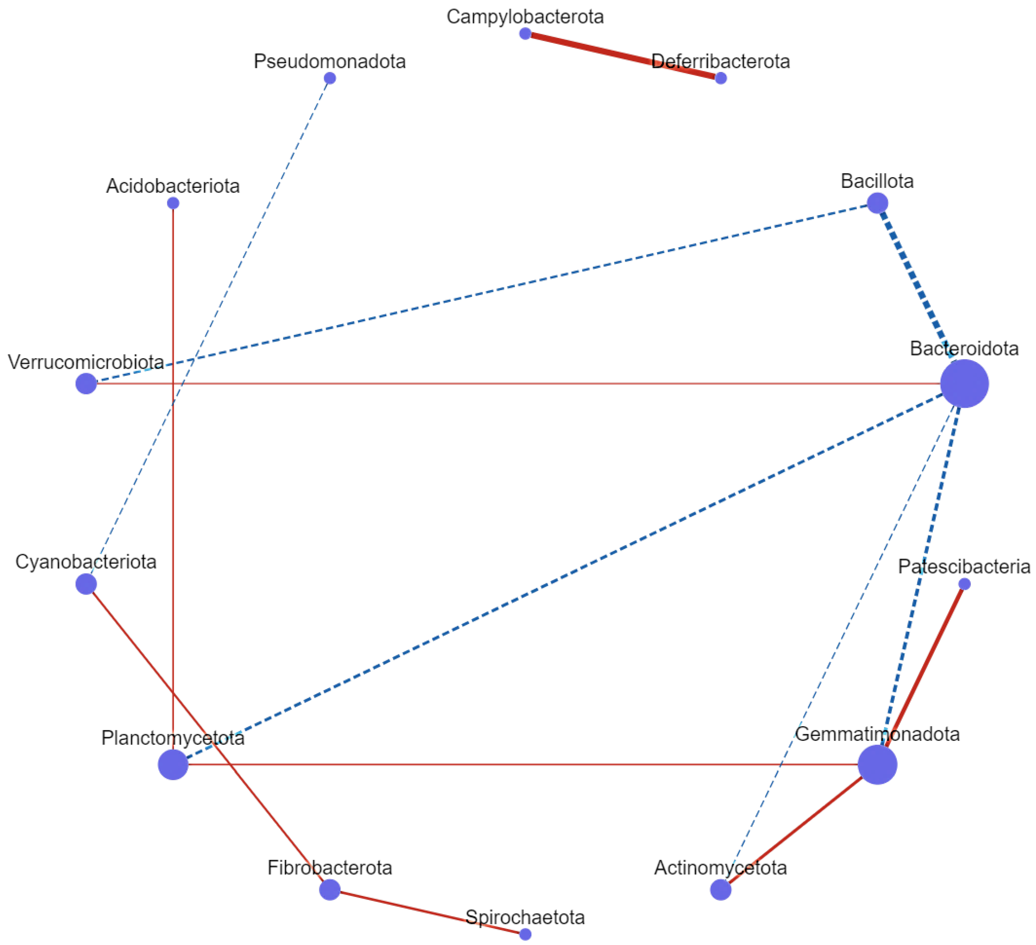 Figure 10. Network analysis reveals the relationship between several microbes. Red lines represent positive connections, whereas the blue lines represent a negative correlation. The control group, EF109, EF108, BF109, and BF108 groups.