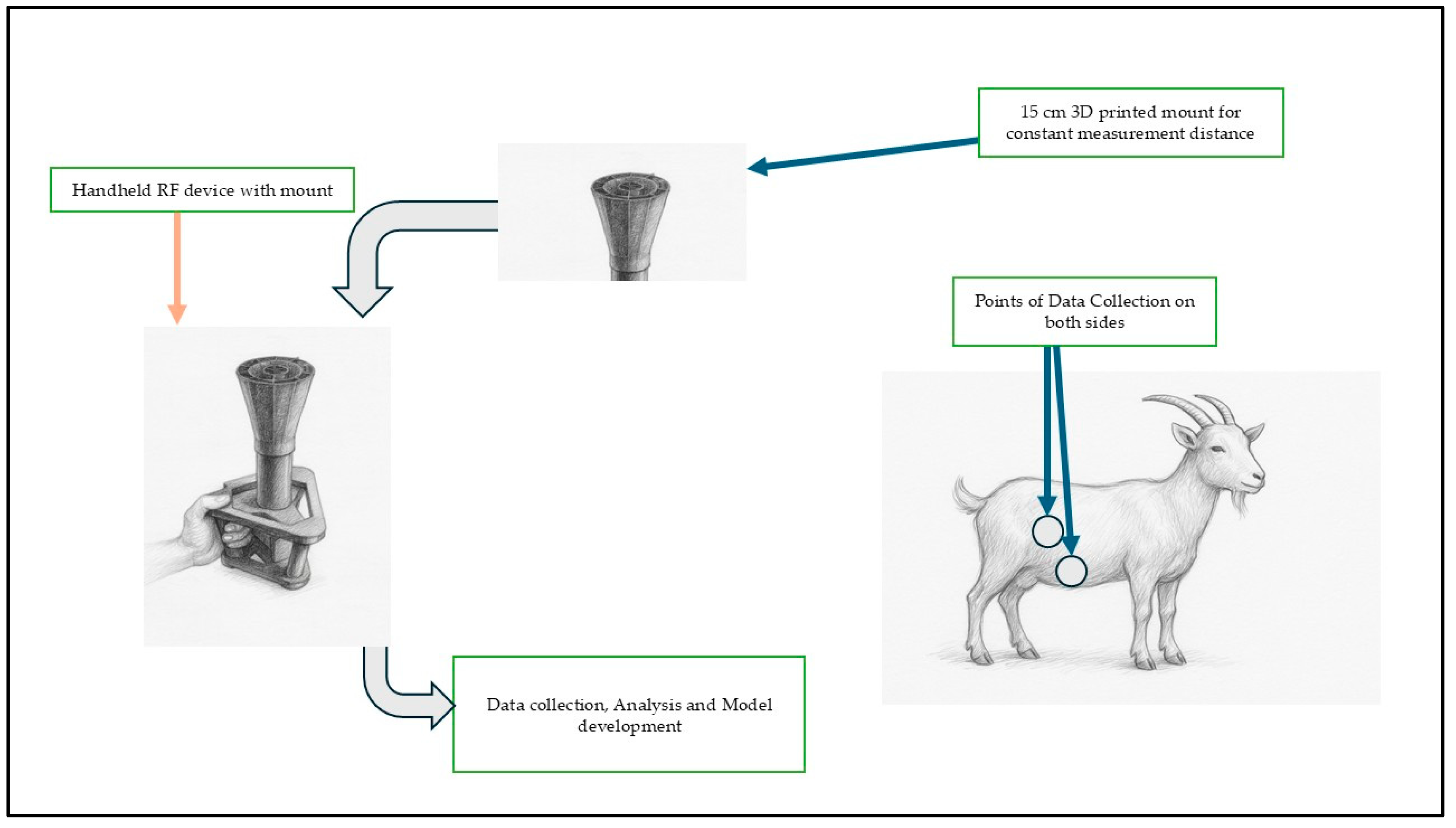 The proof-of-concept study employed a longitudinal, non-invasive design in which RF measurements were repeatedly collected from each goat at multiple body locations. Although only eight goats were used, the design leveraged repeated within-animal sampling to capture intra- and inter-individual variation in RF signatures over time. Four anatomical sides per goat (left lateral, right lateral, dorsal, and ventral regions) were selected for RF data acquisition, thereby maximizing spatial coverage of body tissues and physiological states. This approach yielded a robust dataset while minimizing animal numbers, in line with the 3Rs principle (Replacement, Reduction, and Refinement) of ethical animal use.