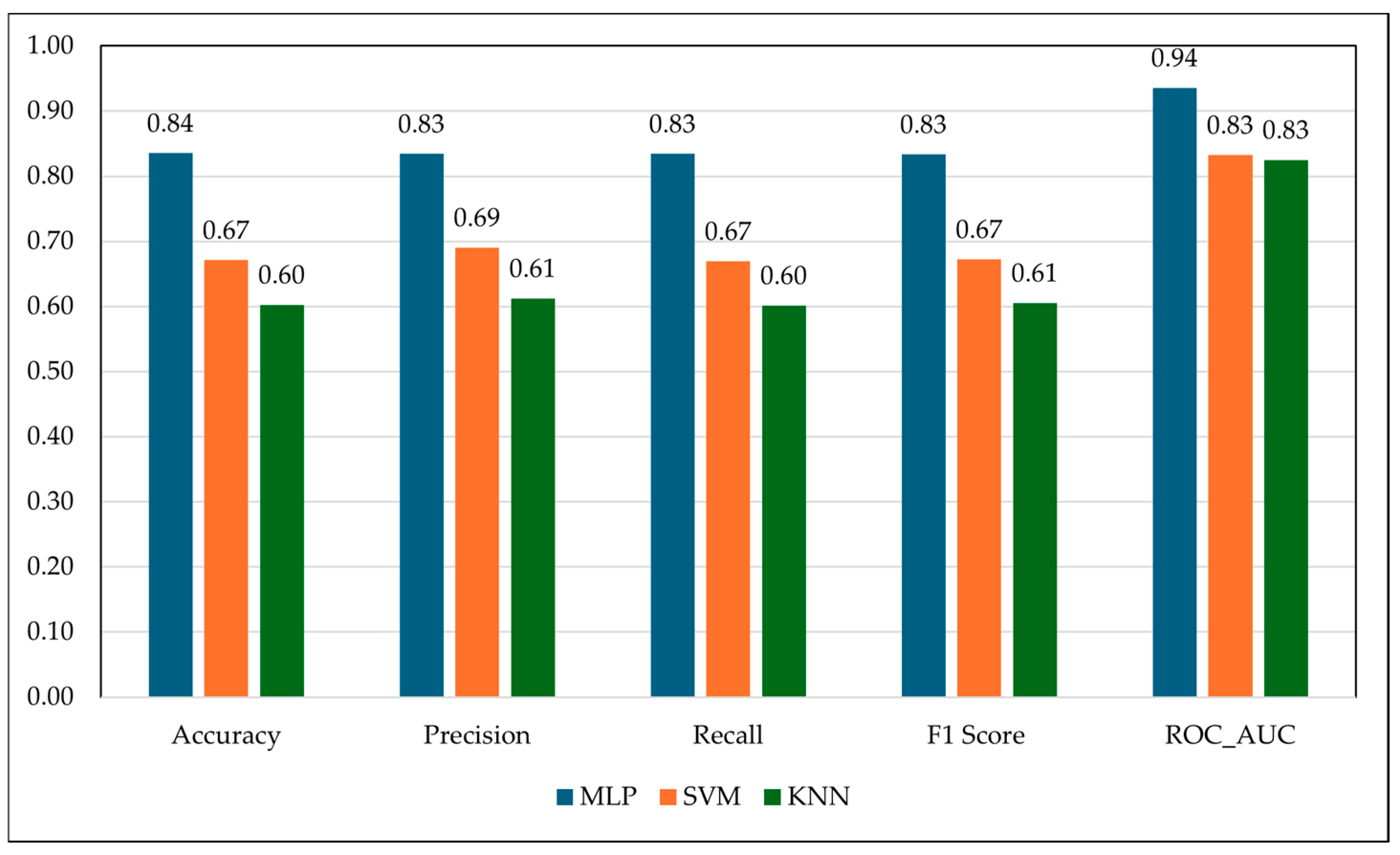 Among the evaluated models, the multilayer perceptron (MLP) showed a greater capacity to capture non-linear spectral interactions than SVM and KNN [