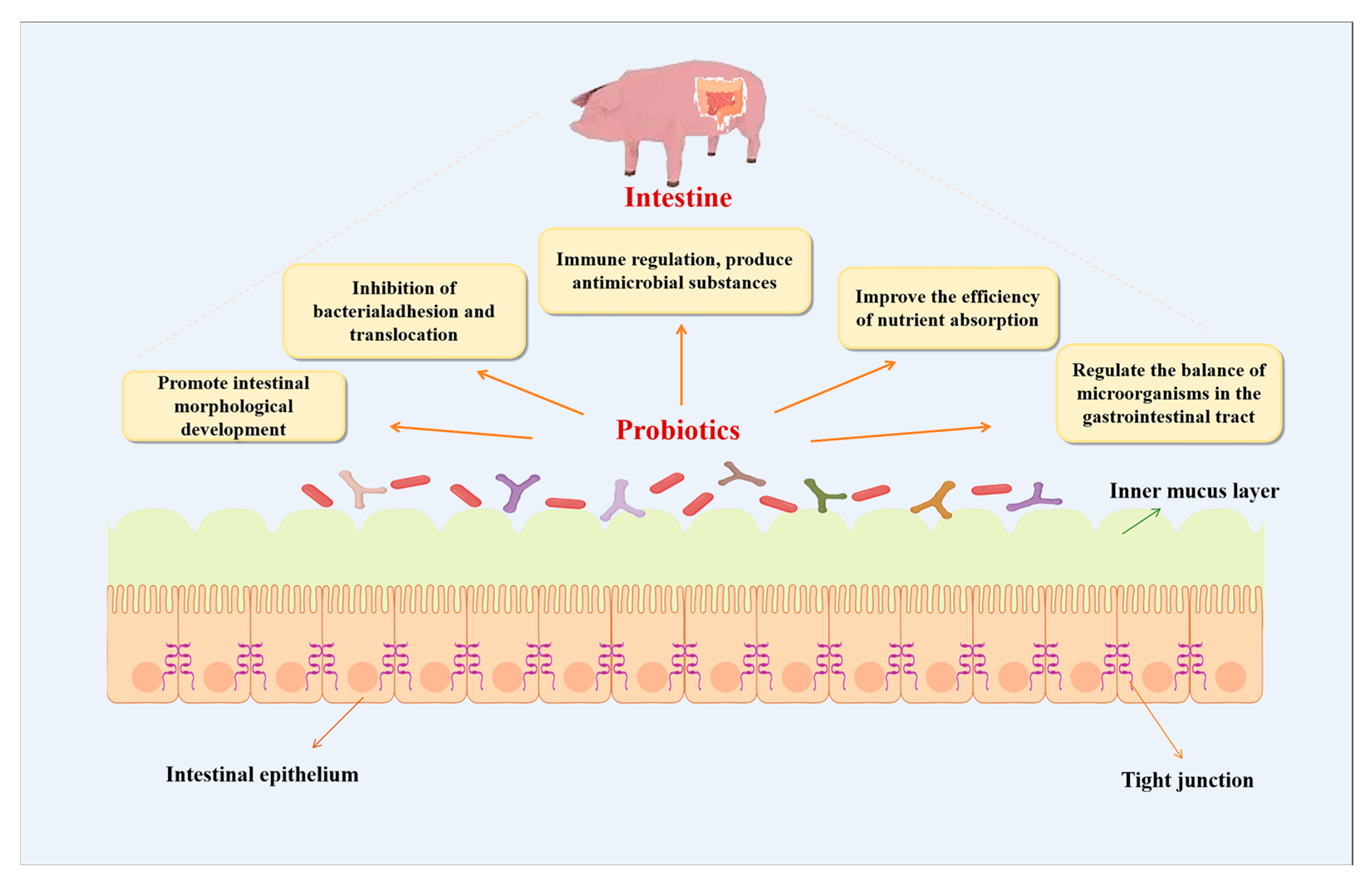 Swine-derived probiotic metabolites represent a promising class of natural bioactive compounds that contribute to intestinal health through multidimensional mechanisms including the promotion of morphological development, immune modulation, enhancement of nutrient absorption, metabolic optimization, and maintenance of microbial homeostasis. These integrated functions suggest considerable potential as part of antibiotic-reduction strategies, although their application requires further validation under commercial conditions (Figure 3).