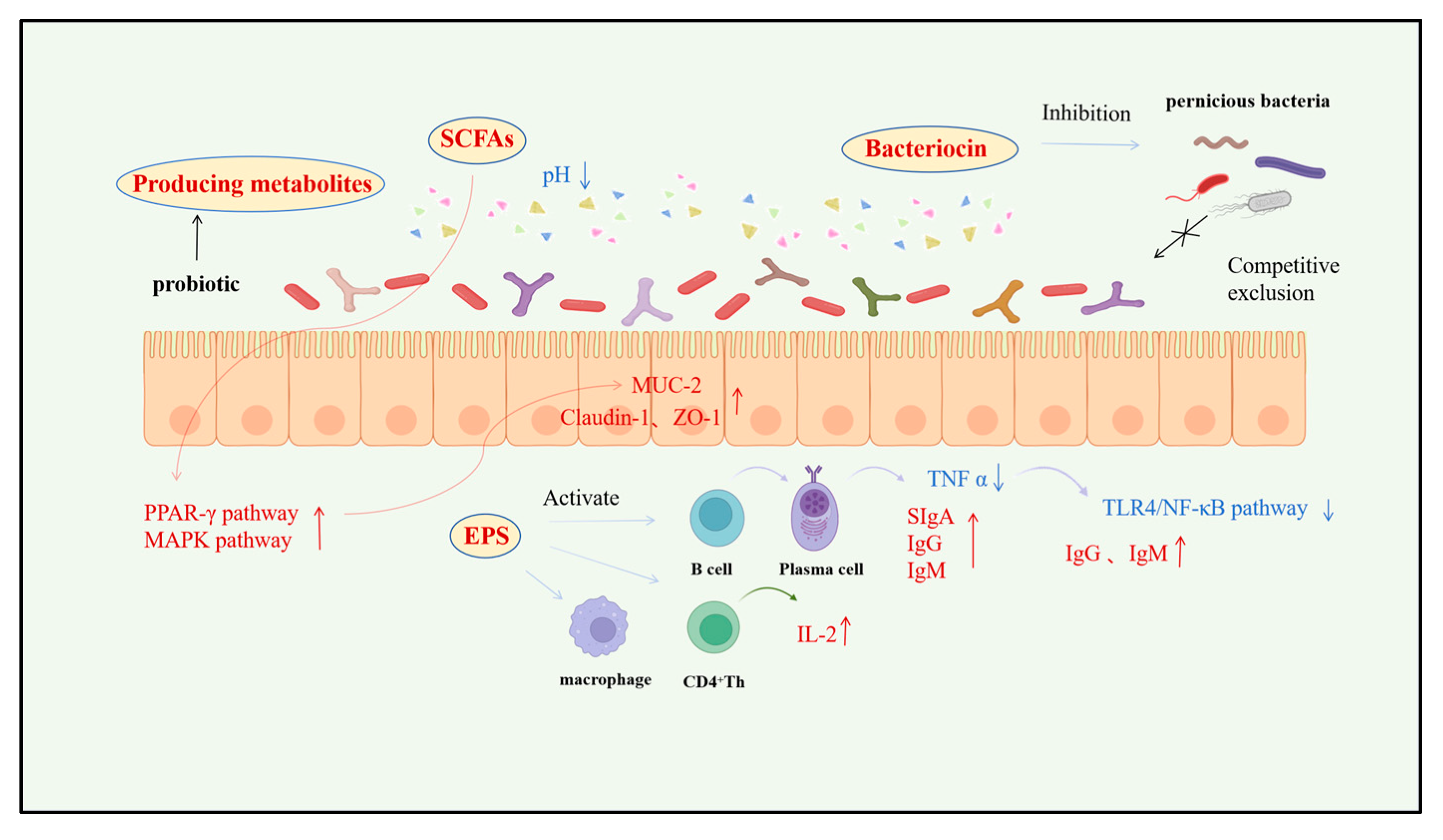 Furthermore, metabolites from beneficial strains have been shown in some models to alleviate inflammatory signaling, such as the TLR4/NF-kappaB pathway, which is implicated in barrier dysfunction [123]. Yin [124] discovered that metabolites from porcine beneficial strains alleviate dextran sulfate sodium (DSS)-induced colitis and intestinal barrier damage in mice by suppressing TLR4/NF-kappaB inflammatory signaling. Zhang [125] further demonstrated that Lactobacillus plantarum ameliorates Clostridium perfringens-induced barrier dysfunction and inflammatory cascades through coordinated regulation of TLR4/NF-kappaB signaling and mitophagy.