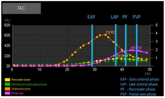 For patients in the Dynamic 4D CT group (Group P), four circular regions of interest (ROIs) were drawn: one over each pancreatic lesion, sized according to the lesion’s dimensions; one on the most homogeneous, vessel-free portion of the pancreatic parenchyma; and one each covering the entire cross-section of the cranial abdominal aorta and the portal vein at the level of the hepatic hilum. From the analysis of these four ROIs, the software created four time-attenuation curves (TACs) with the attenuation expressed by Hounsfield units (HU) on the Y-axis and the time expressed in seconds (s) on the X-axis (Figure 1). As previously described [], four vascular phases were identified: (1) the early arterial phase (EAP), in which only the aorta is enhanced, before the portal vein begins to enhance; (2) the late arterial phase (LAP), after the peak of aortic attenuation when clear inflow of contrast into the portal vein is observed; (3) the pancreatic phase (PP), at the peak of attenuation of normal pancreatic parenchyma; and (4) the portal venous phase (PVP), at the peak of portal vein enhancement. Tumor and parenchymal attenuation (HU) values were recorded at these four time points.