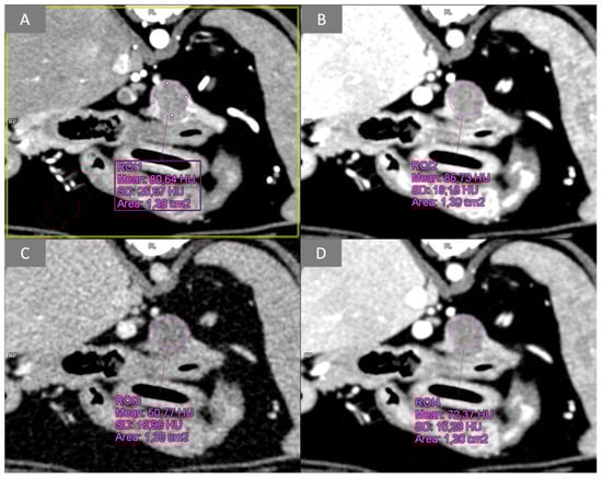 Dual-energy CT analysis did not reveal any statistically significant results in this study. At our center, the abdominal CT protocol includes DE scanning in the portal venous phase, whereas the arterial and interstitial phases are performed using single-energy acquisition (120 kVp). Three different CT volume datasets from dual-energy (DE) scans are routinely evaluated: images at 100 kVp, 120 keV (mixed), and 150 kVp. In humans, for general abdominal applications, virtual monoenergetic images at 70 keV have been demonstrated to have better objective and subjective image quality than at 120 kVp images []. A lower energy level is often used for pancreatic applications, with most reported studies using 50–70 keV VMI images as optimal for pancreatic imaging, as these lower energy levels accentuate subtle differences in iodine contrast []. Another study, with both arterial and portal phases acquired with dual-energy spectral imaging, reported an optimal energy level based on CNR measurement for pancreatic tumors in the range of 45–60 keV []. Ideally, both acquisition and post-processed VMI at lower energy levels (50–100 keV) would have been evaluated. However, the resulting increase in image noise may have compromised the assessment of other abdominal structures—crucial for detecting metastases and guiding informed treatment decisions [].