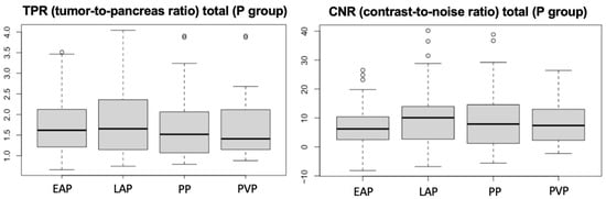 Boxplots of TPR and CNR for group P, with statistical analysis indicating the mean values. EAP= early arterial phase, LAP = late arterial phase, PP = pancreatic phase, PVP = portal venous phase.