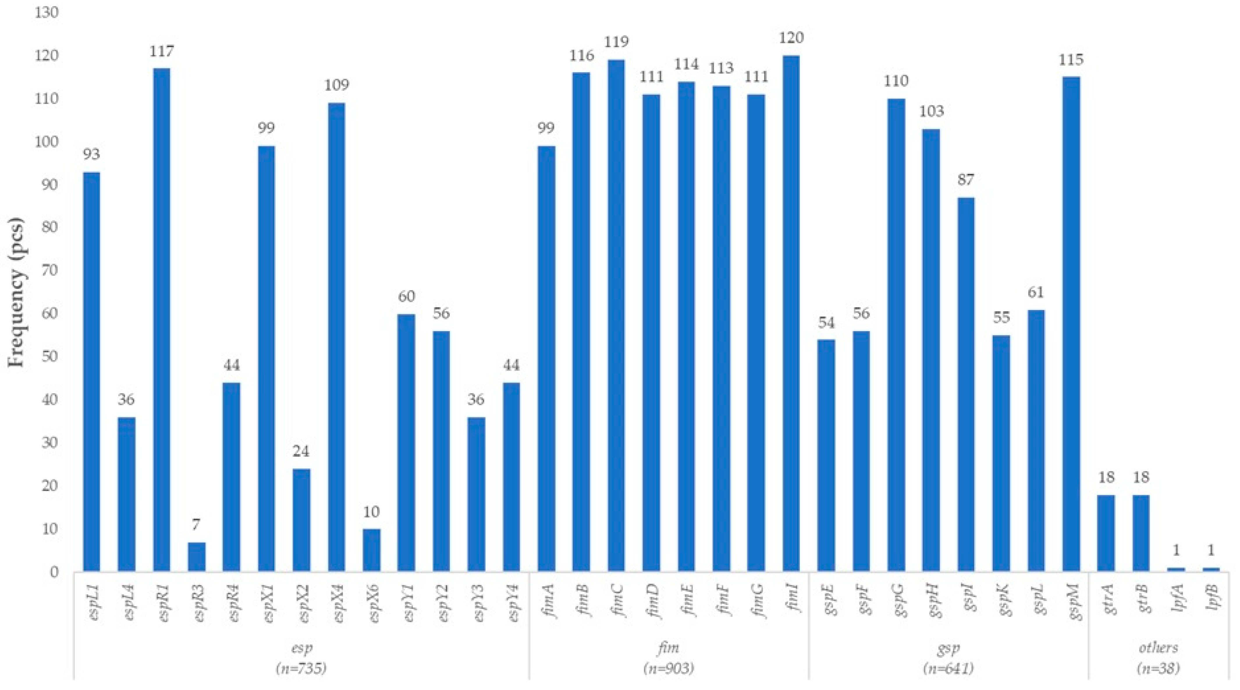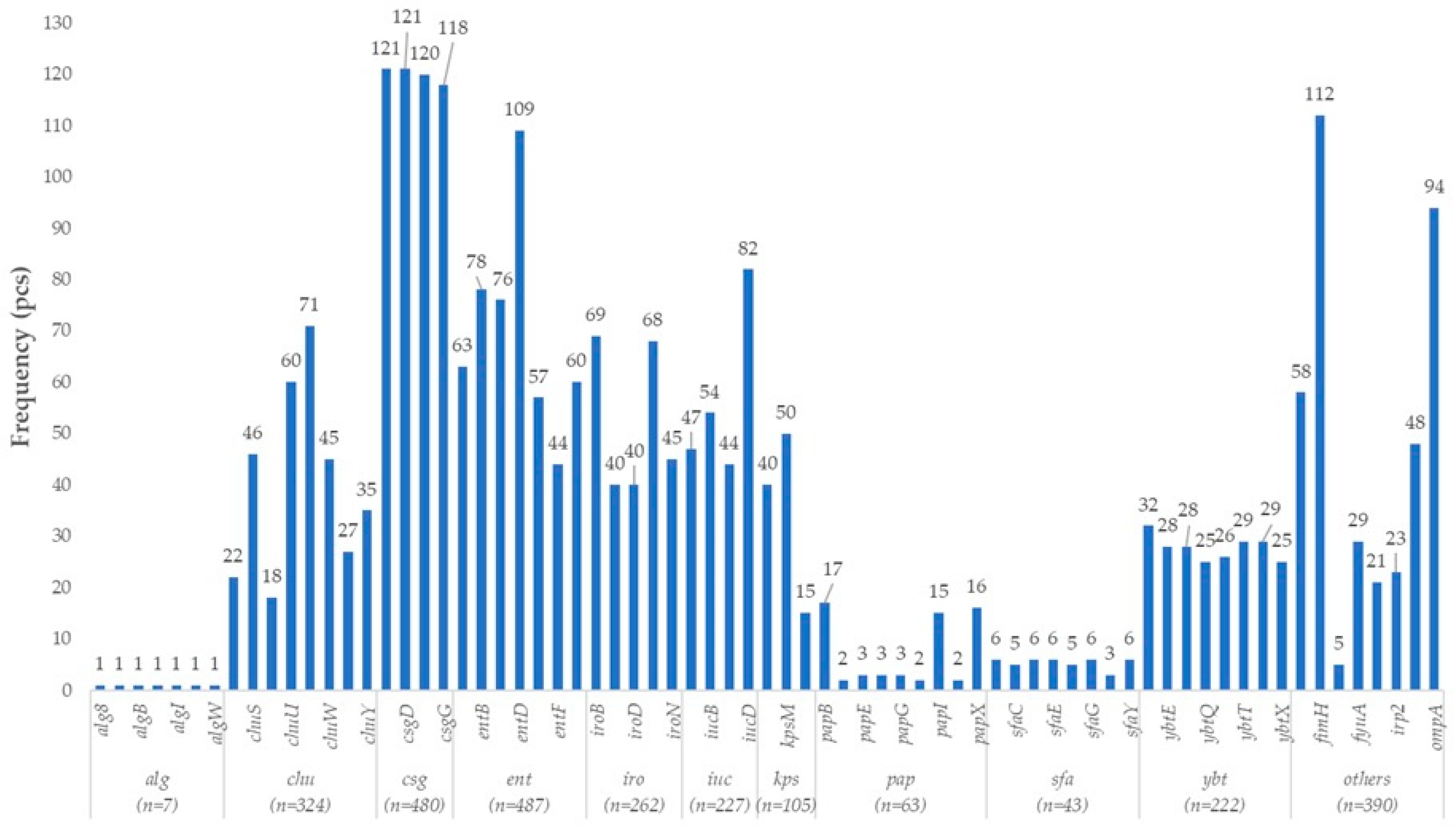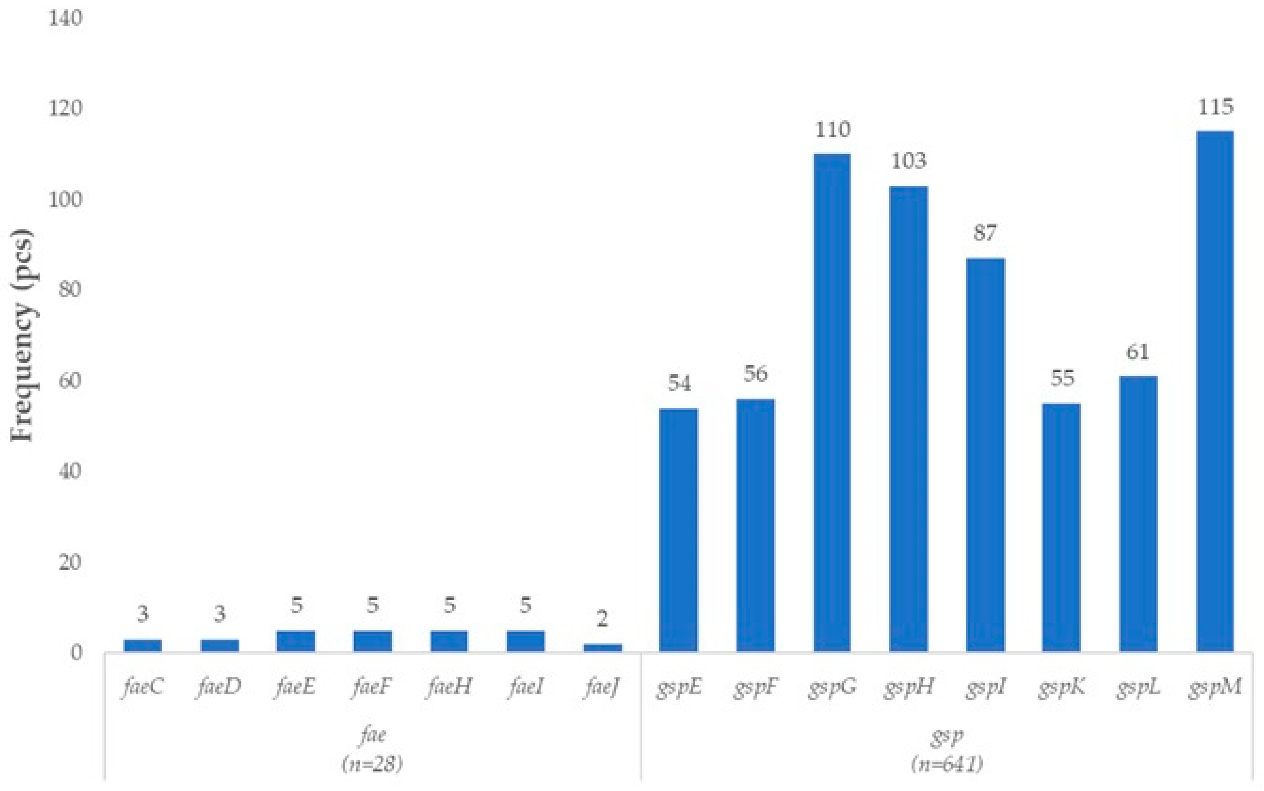3.2. Distribution of Virulence Genes Based on Pathotypes